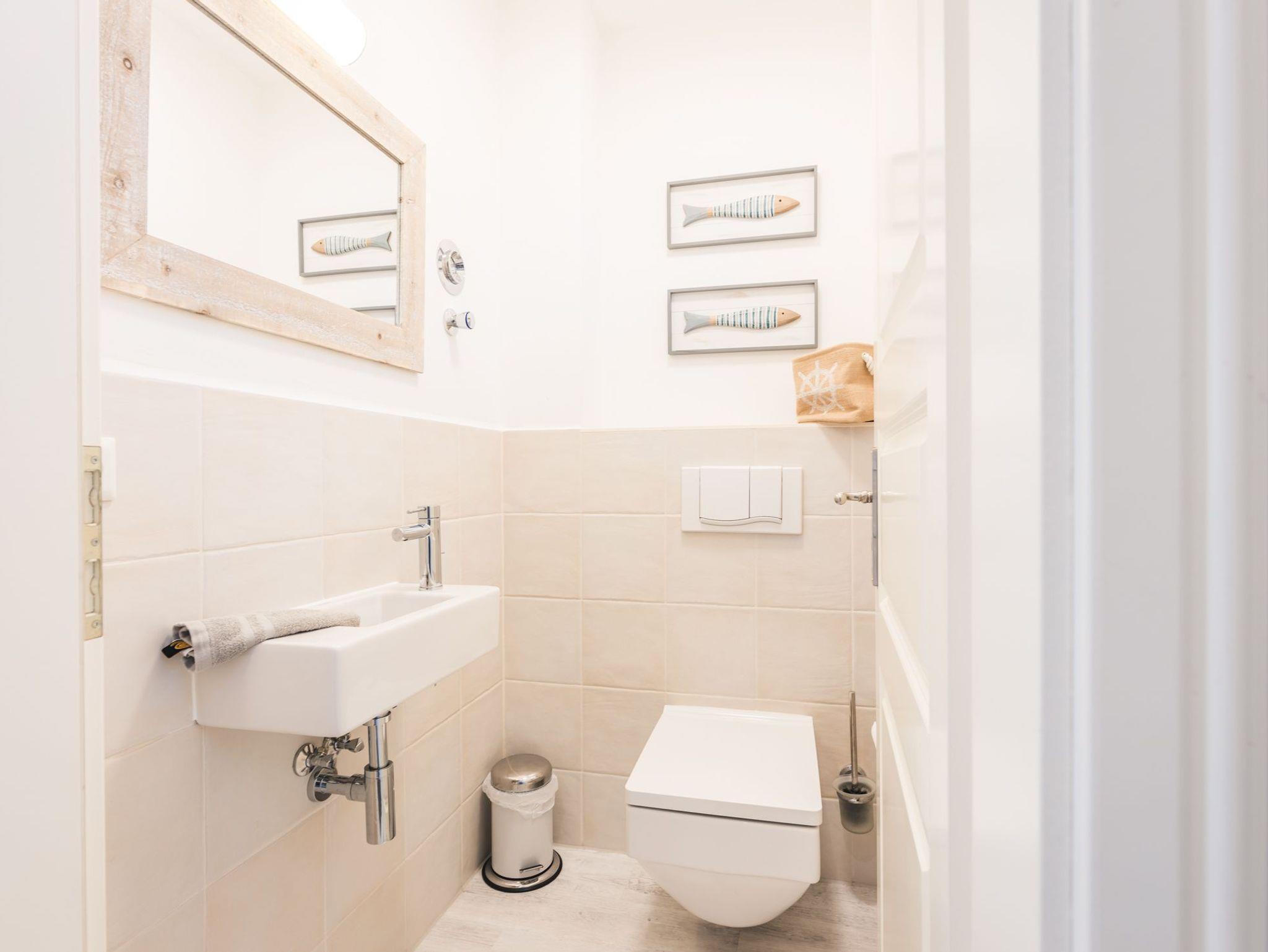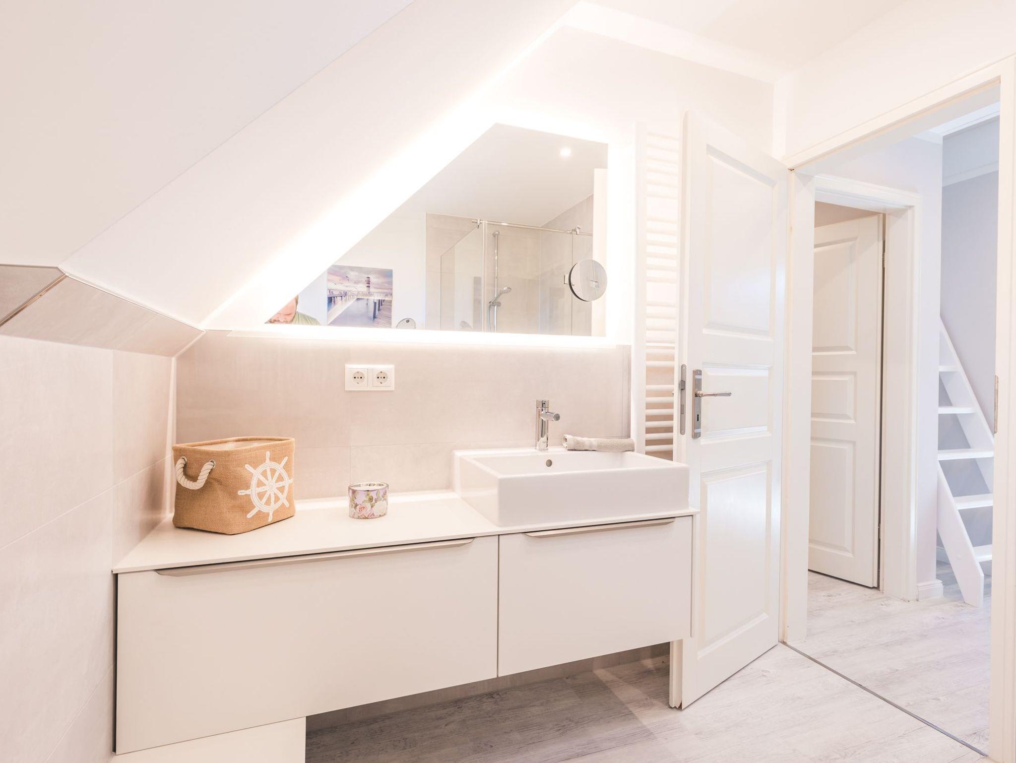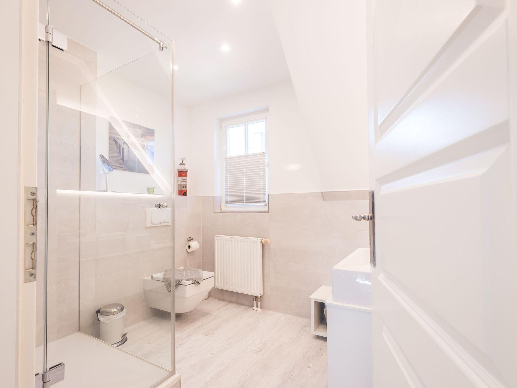 Das moderne, großzügige Badezimmer in der oberen Etage ist geschmackvoll und mit Markenfabrikaten eingerichtet. Entspannen Sie nach einem Spaziergang, Strandlauf oder Bad in der Ostsee in der großzügigen Dusche und genießen Sie die vom Handtuchheizkörper vorgewärmten Handtücher.