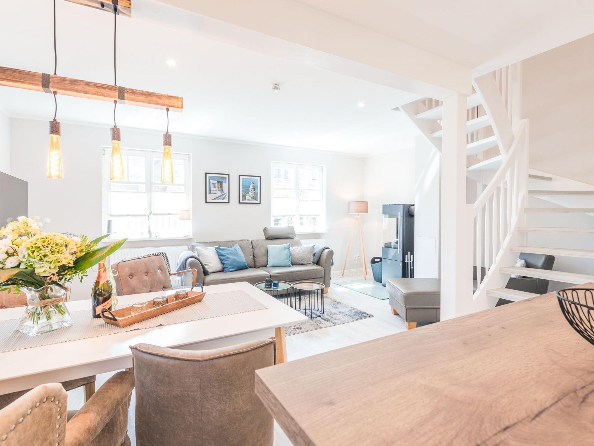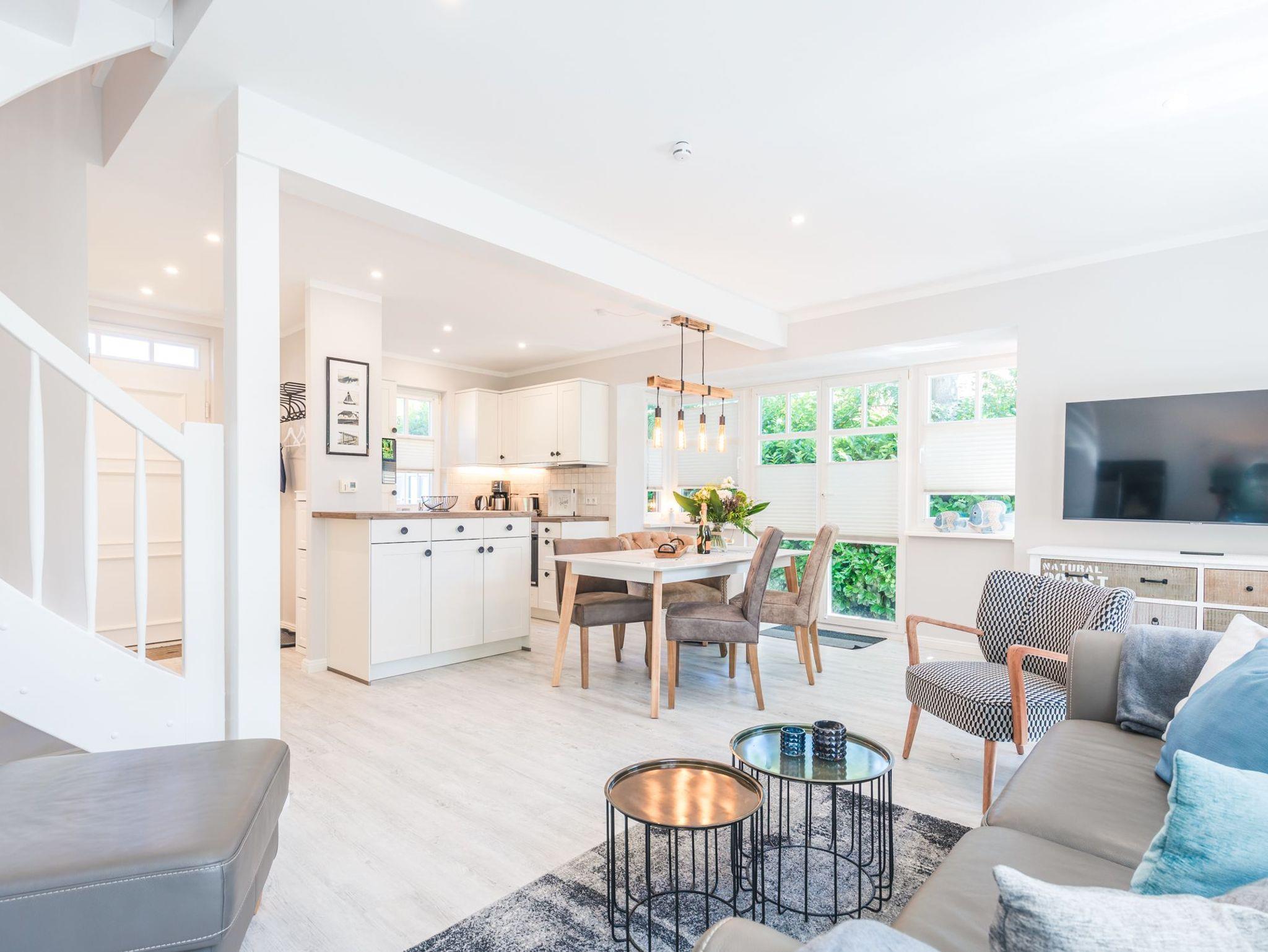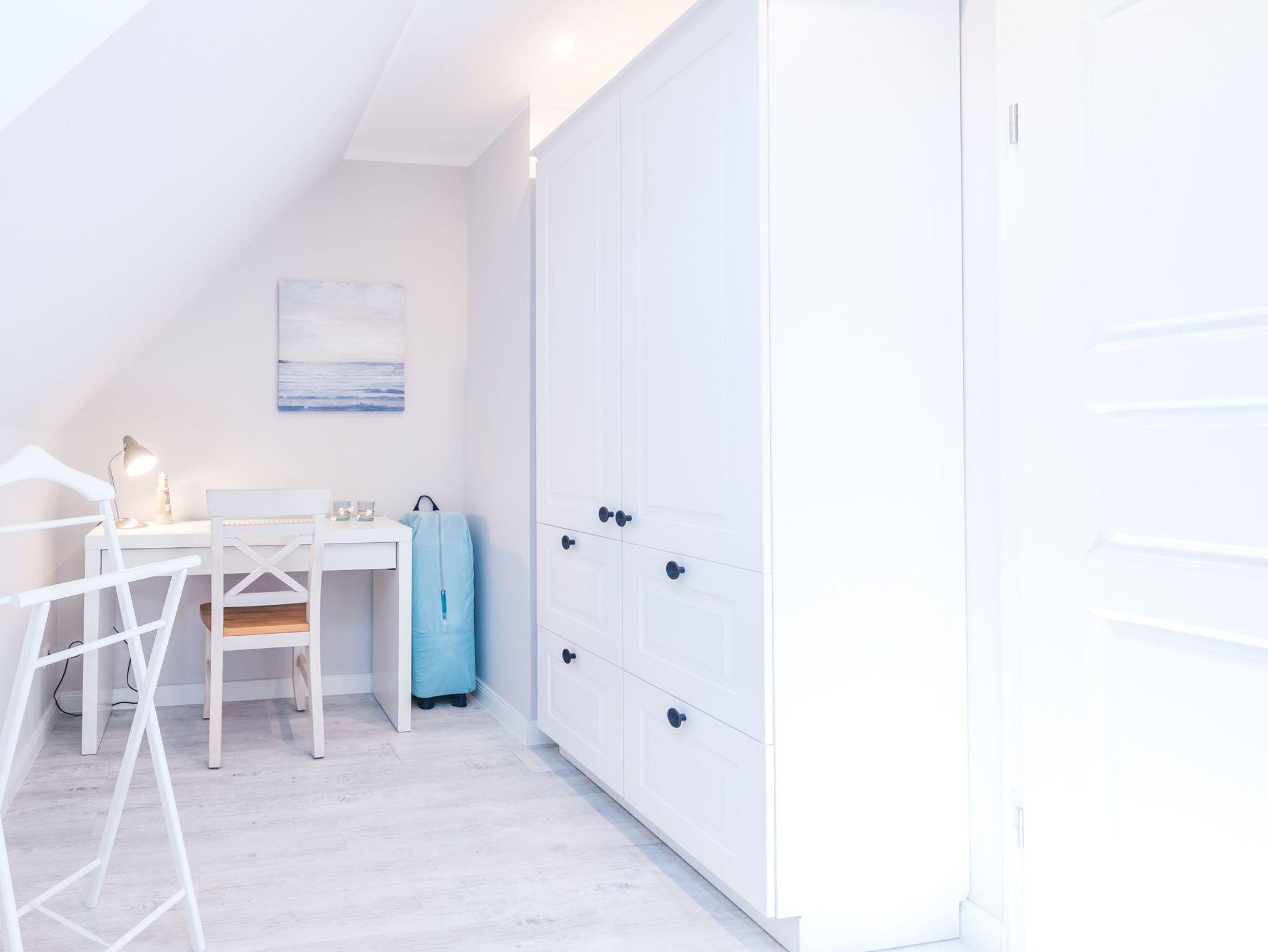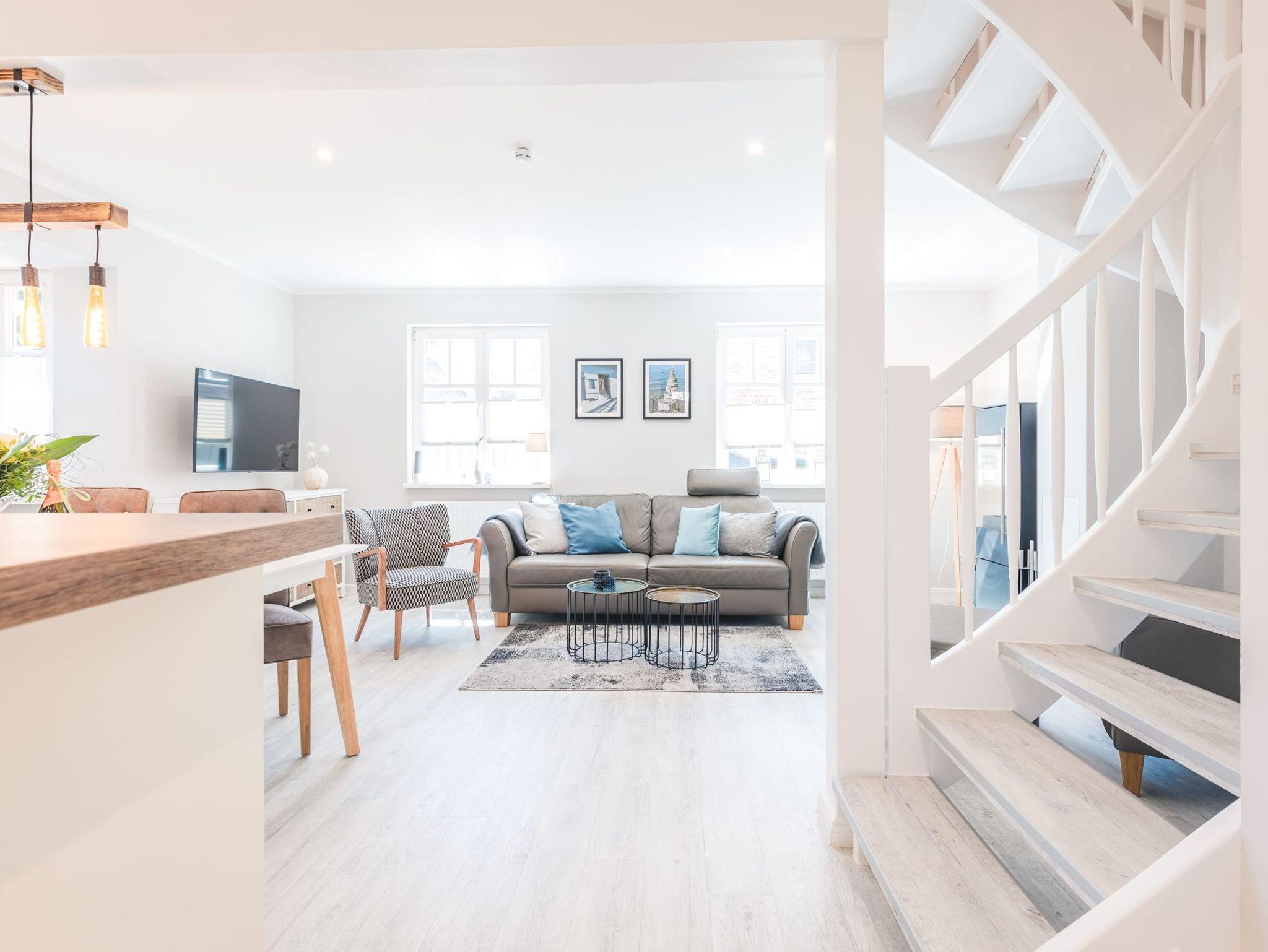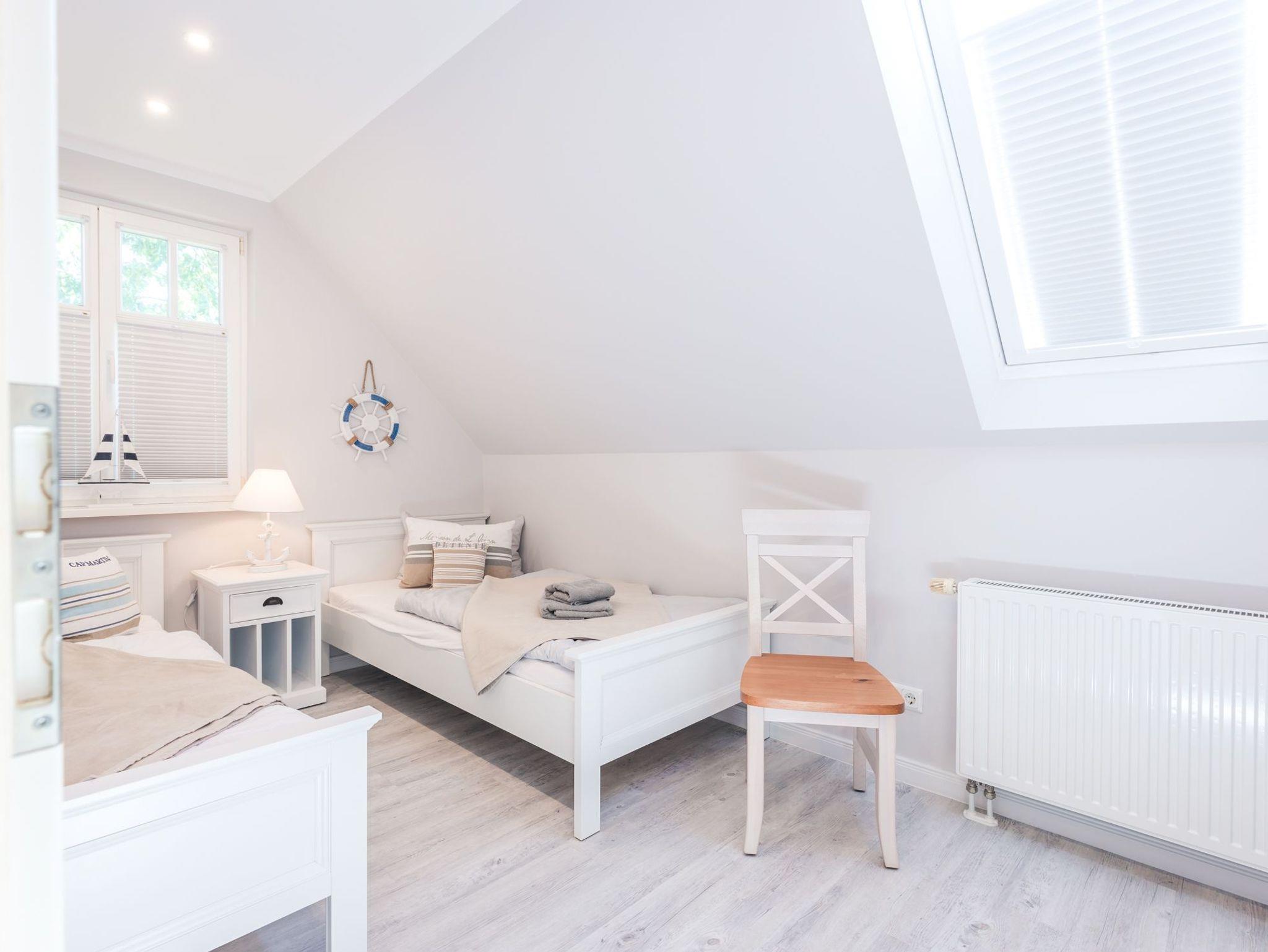 Über eine breite komfortable Treppe erreichen Sie die obere Etage mit zwei behaglichen Schlafzimmern. Das größere von beiden ist mit einem komfortablen Doppelbett, einem großzügigen Kleiderschrank sowie einen schwenkbaren Smart-TV ausgestattet. Das zweite Schlafzimmer besticht mit seinem maritimen Flair. Ein großes Dachfenster lässt viel Licht in den Raum mit zwei Einzelbetten, einem Kleiderschrank, einem kleinem Sekretär und einem weiteren schwenkbaren Smart- TV.