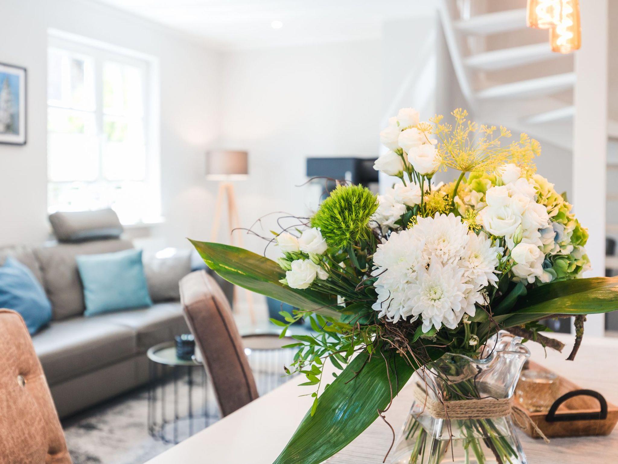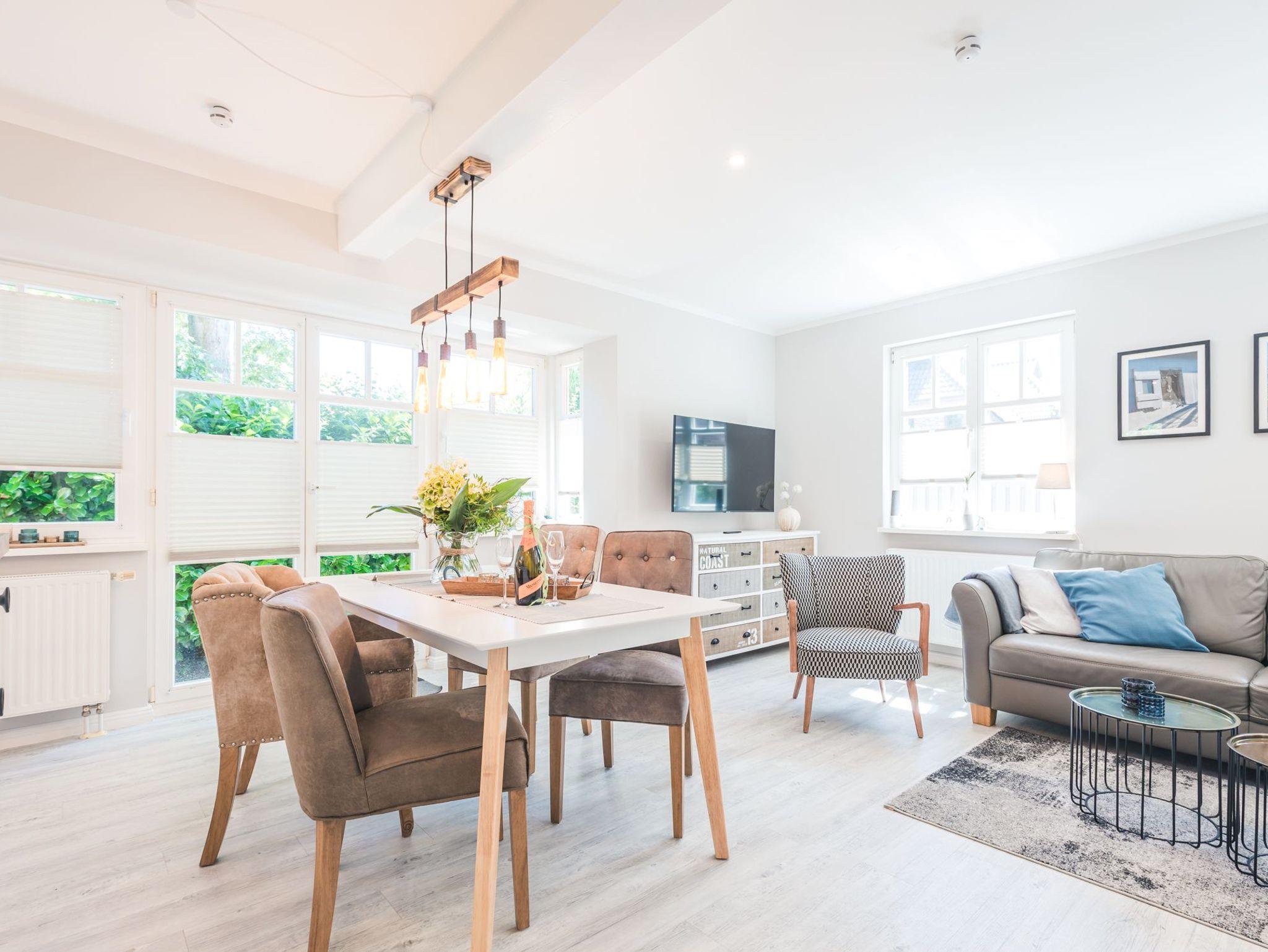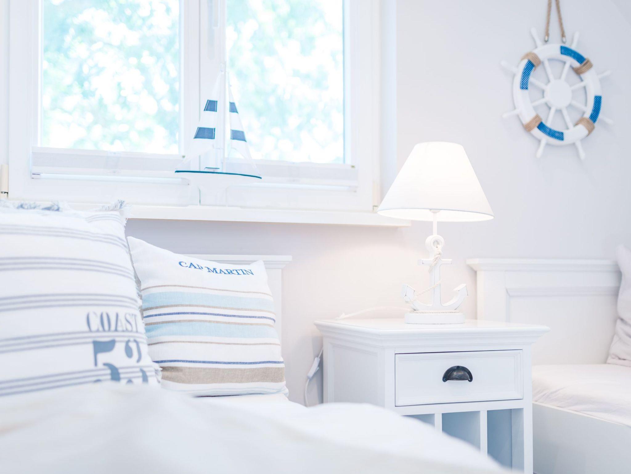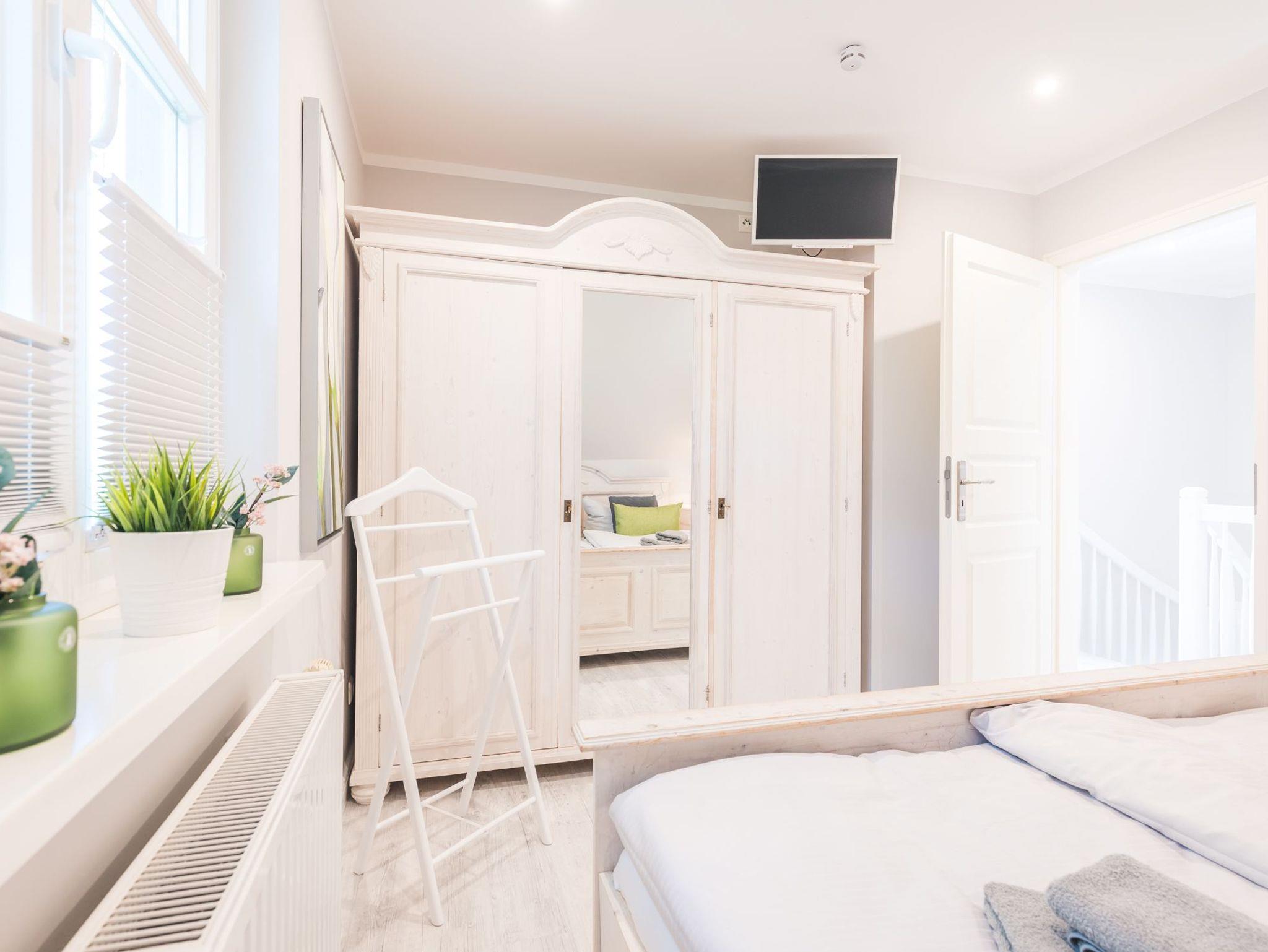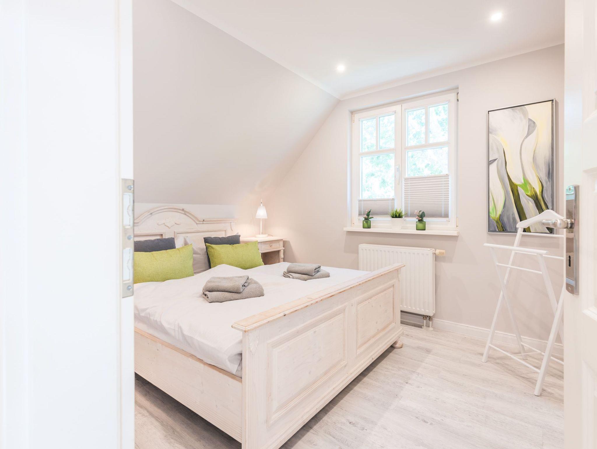 Über eine breite komfortable Treppe erreichen Sie die obere Etage mit zwei behaglichen Schlafzimmern. Das größere von beiden ist mit einem komfortablen Doppelbett, einem großzügigen Kleiderschrank sowie einen schwenkbaren Smart-TV ausgestattet. Das zweite Schlafzimmer besticht mit seinem maritimen Flair. Ein großes Dachfenster lässt viel Licht in den Raum mit zwei Einzelbetten, einem Kleiderschrank, einem kleinem Sekretär und einem weiteren schwenkbaren Smart- TV.