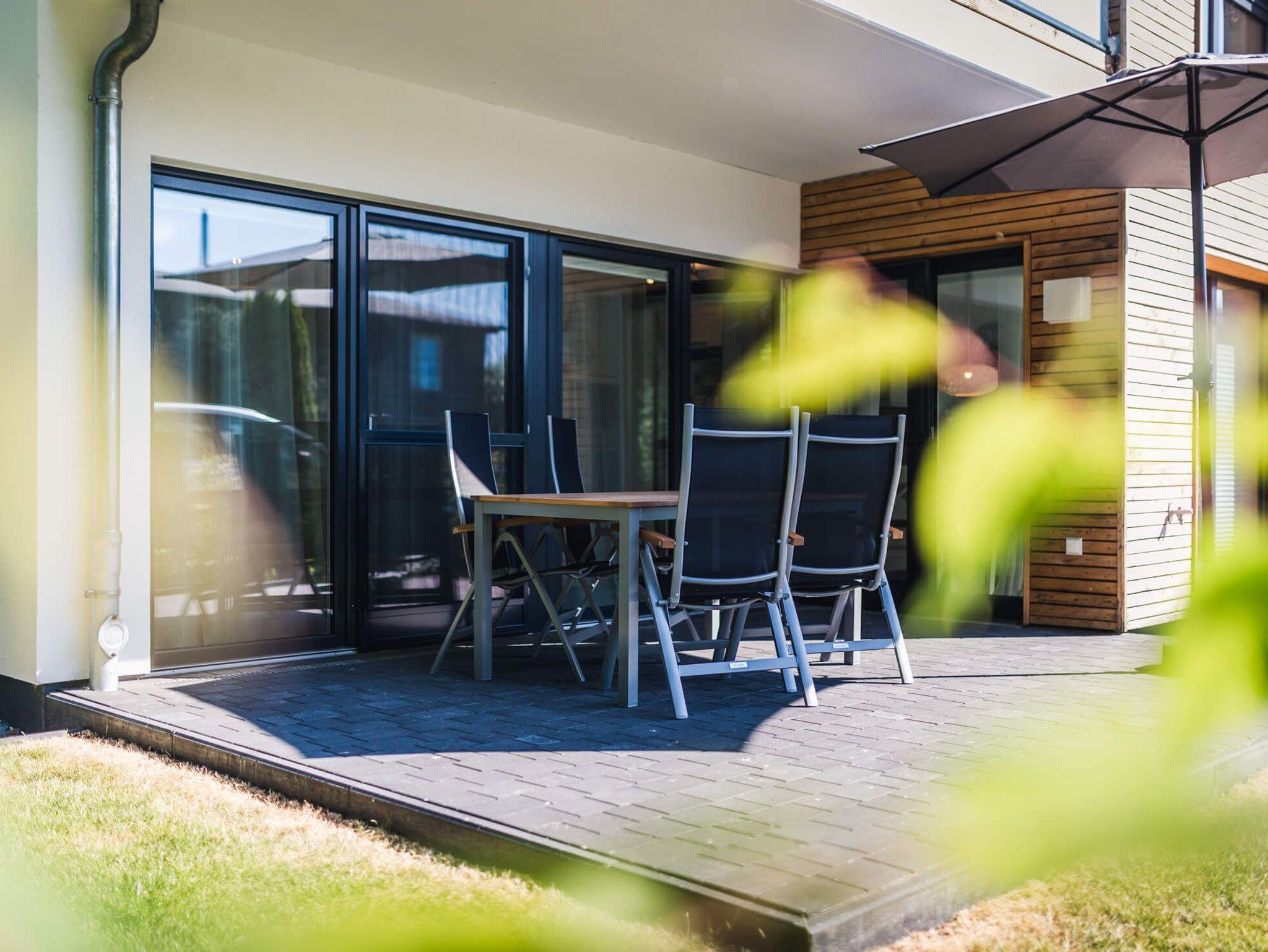 Auf der sonnigen Süd-Terrasse können Sie auf bequemen Gartenmöbeln den Tag ausklingen lassen oder sich das Frühstück schmecken lassen.