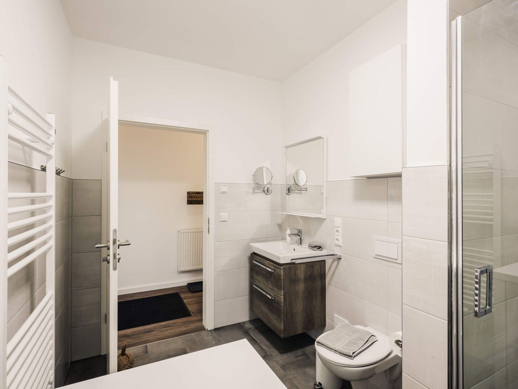 Das moderne Bad mit Fußbodenheizung bietet Ihnen auch eine bodengleiche Dusche sowie eine Waschmaschine.