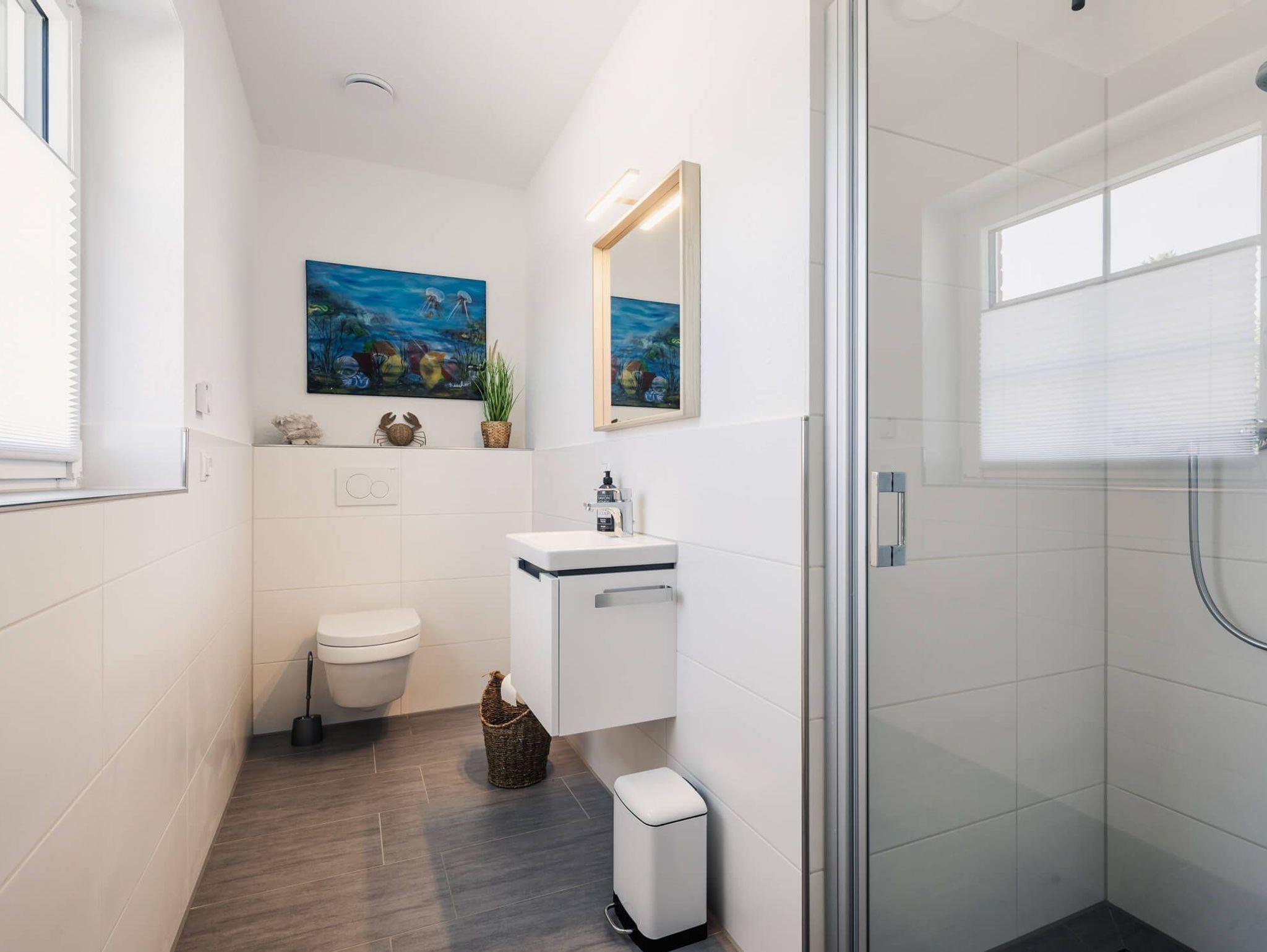 Zusätzlich zu den Schlafzimmern finden Sie in unserem Ferienhaus auch zwei moderne Badezimmer. Diese sind mit Duschen, eins zusätzlich mit einer Badewanne und Sauna ausgestattet und bieten Ihnen den Komfort, den Sie während Ihres Aufenthalts benötigen.
