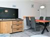 Das einladende Wohnzimmer verfügt über eine bequeme Sitzgruppe, einen Fernseher mit DVD-Player sowie eine Stereo-Musikanlage. Der Esstisch bietet ausreichend Platz für vier Personen – ideal für gemeinsame Mahlzeiten oder gesellige Abende.