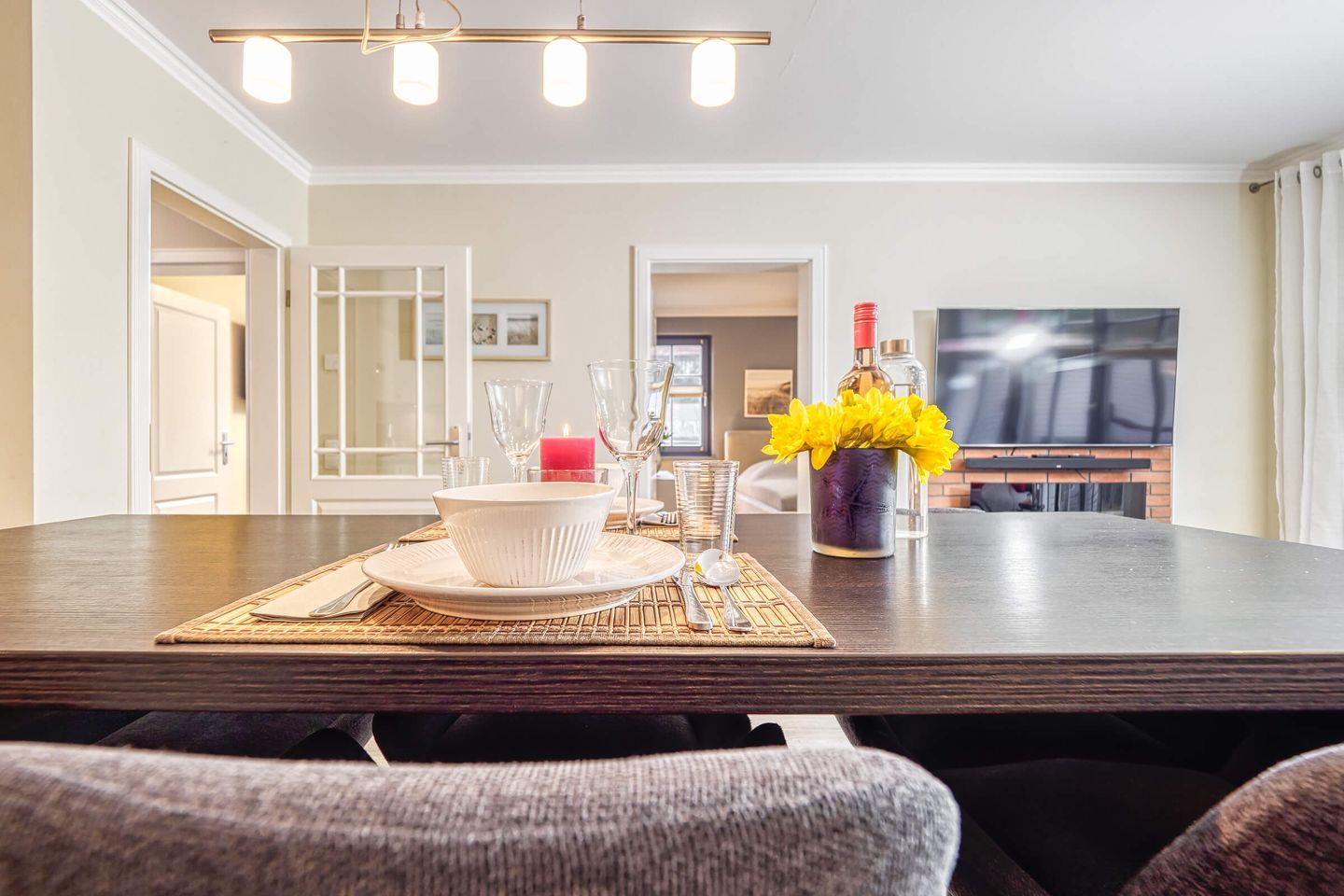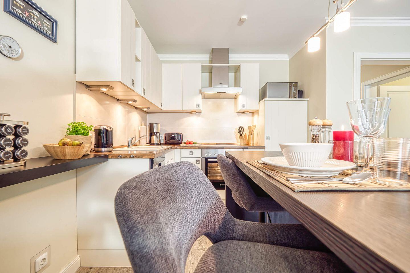 Bosch-Küche mit Herd/Backofen und Mikrowelle, Kühlschrank mit Gefrierfach und Geschirrspülmaschine mit Hoch-Esstisch für bis zu 6 Personen.