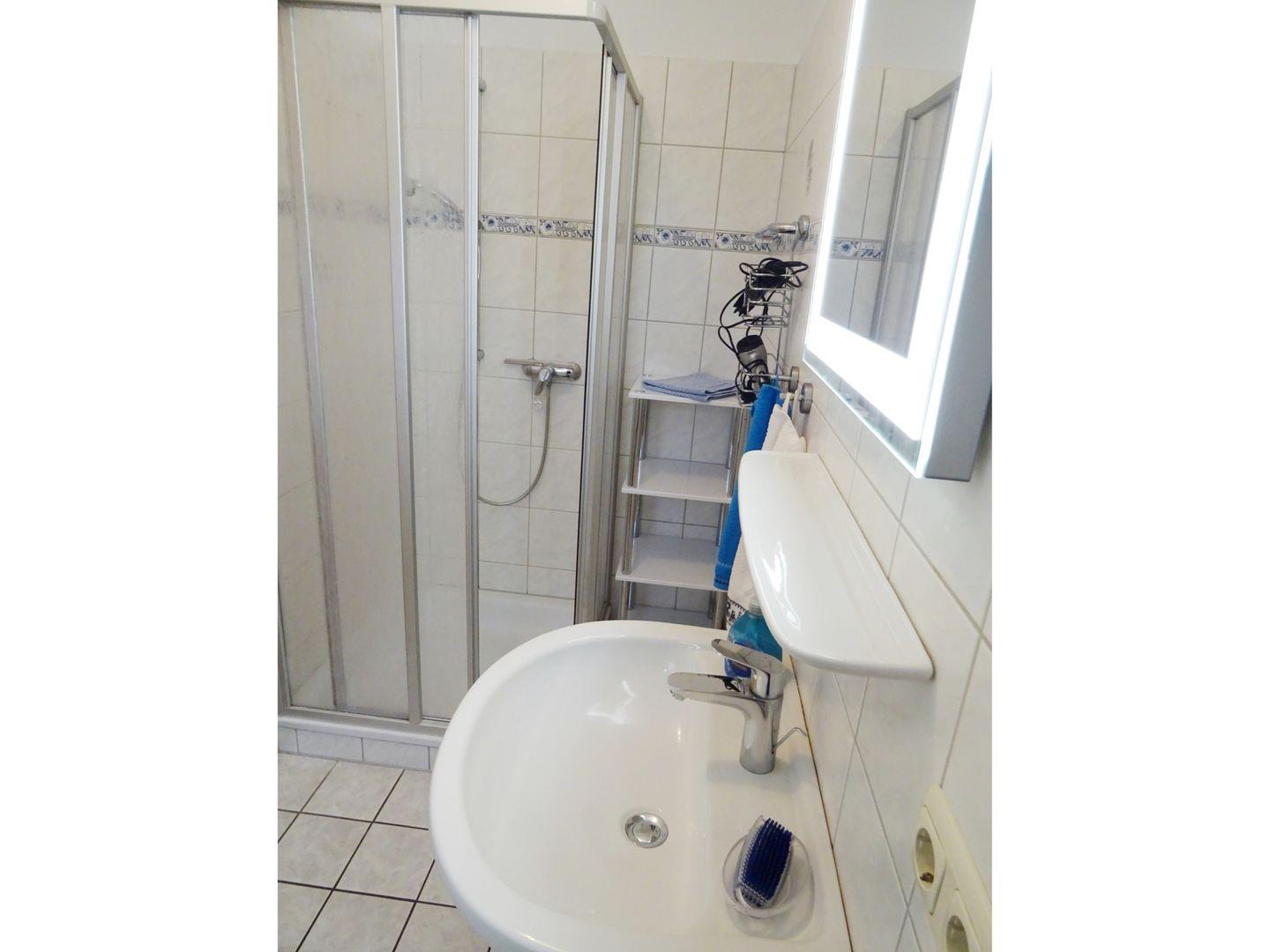 Eines der Schlafzimmer ist mit einem Doppelbett ausgestattet, das andere mit zwei Einzelbetten und einem zusätzlichen Fernseher. Im Badezimmer ist eine Dusche zu finden.