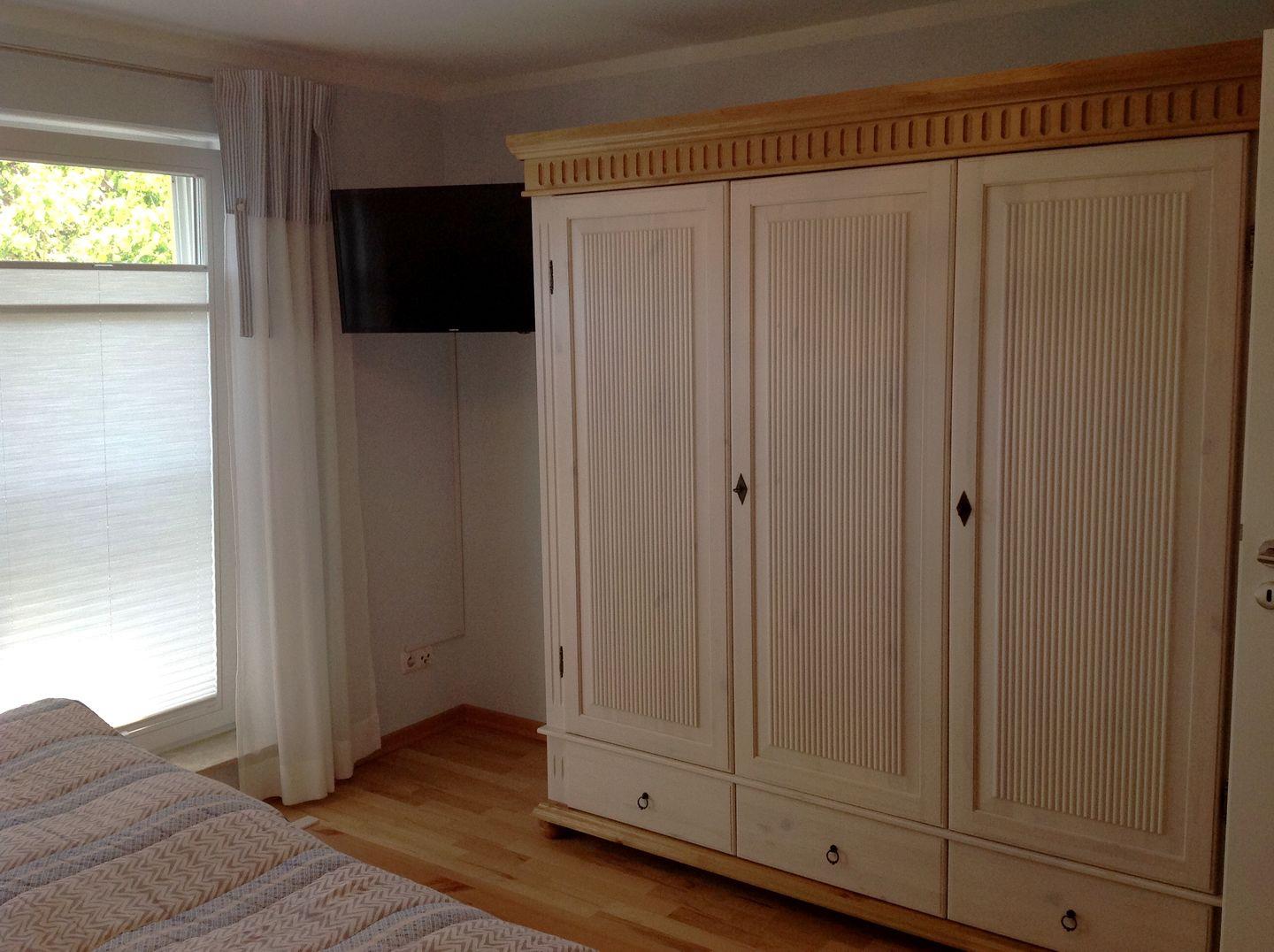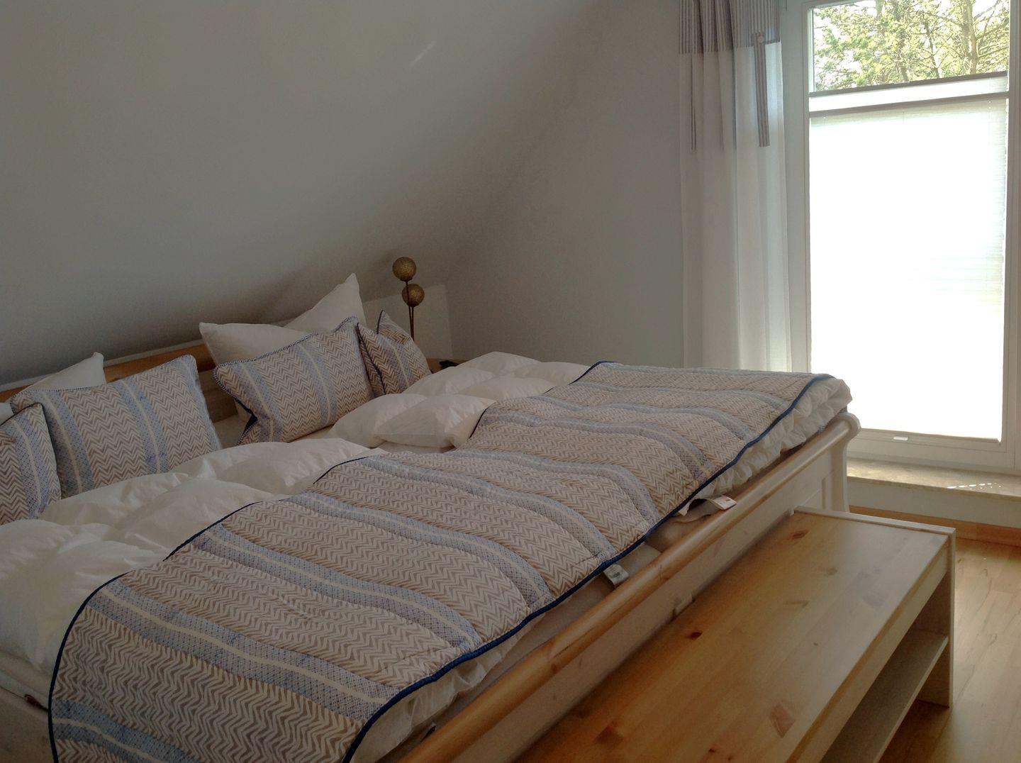 Es gibt zwei Schlafzimmer mit Doppelbett und TV, ein weiteres Schlafzimmer mit zwei Einzelbetten erreichen Sie über eine Treppe zum Dachboden.