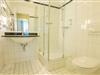 Das Schlafzimmer ist mit einem Doppelbett ausgestattet und das Badezimmer ist mit einer Dusche versehen.