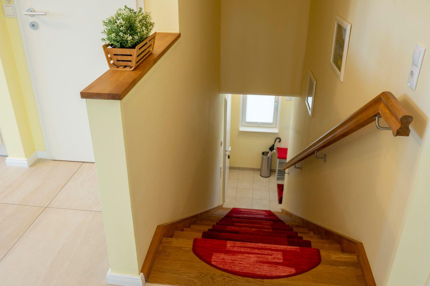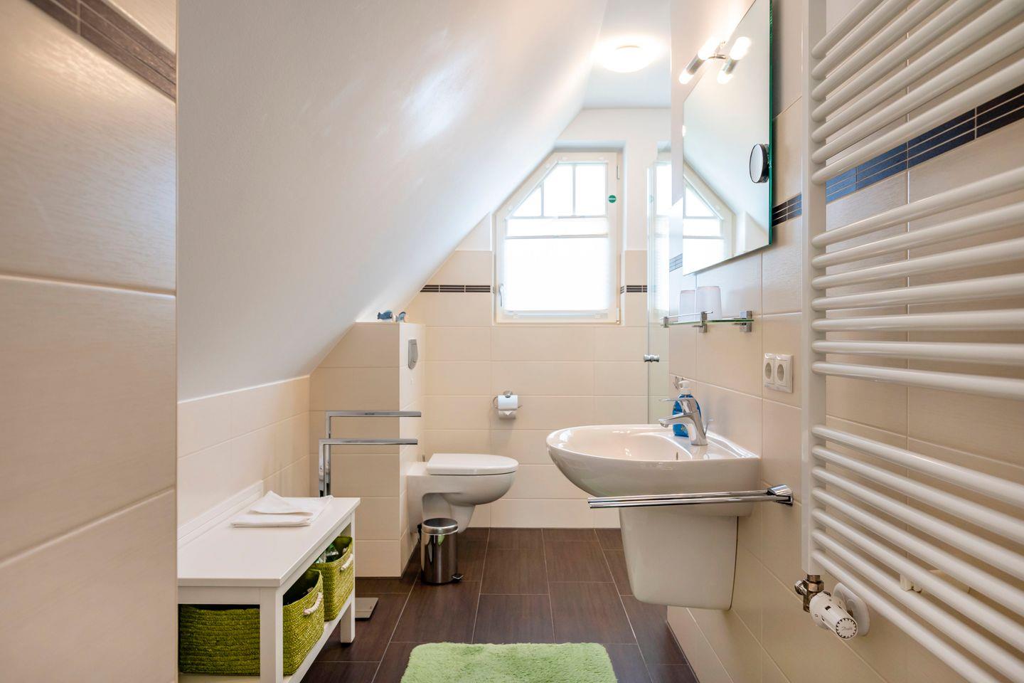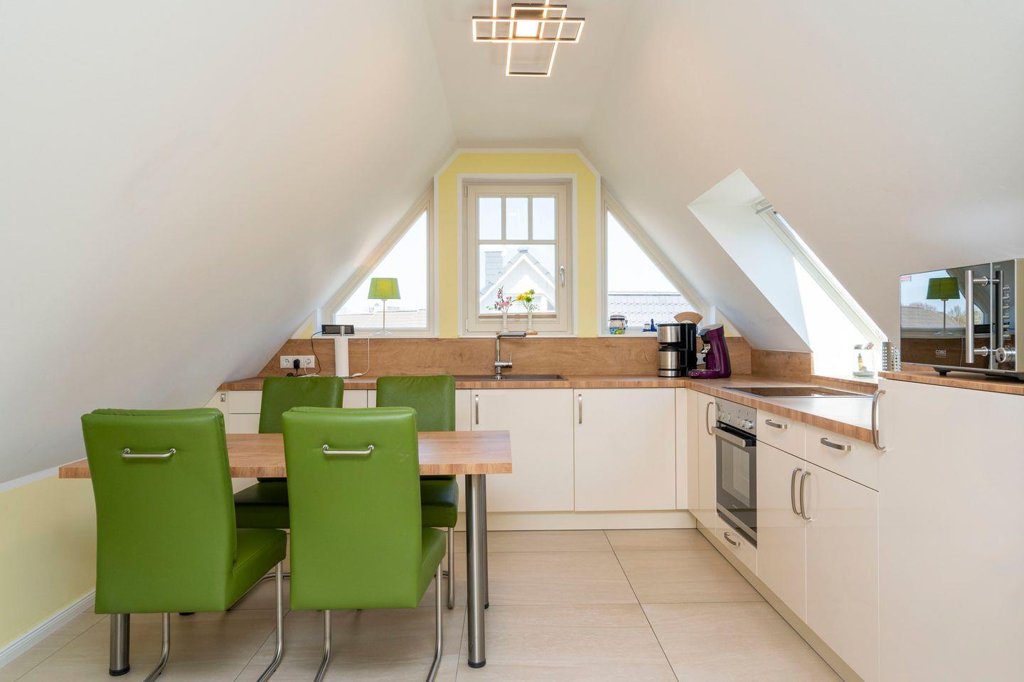 Die 57?m² große Ferienwohnung bietet im Eingangsbereich ausreichend Platz, um Ihre Kleidung bequem unterzubringen. Über eine Treppe gelangen Sie in die Dachgeschosswohnung, die durch eine gelungene Kombination aus Komfort und liebevoller Einrichtung überzeugt.