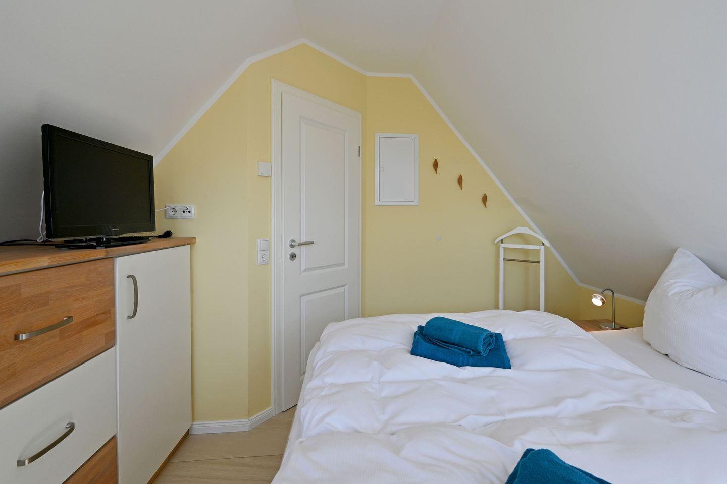 Das separate Schlafzimmer verfügt über ein Doppelbett (180x200), während das bequeme Funktions-Sofa im Wohnbereich als Bett (130x200) genutzt werden kann – ideal für Paare oder kleine Familien, die in Zingst eine FeWo buchen möchten.