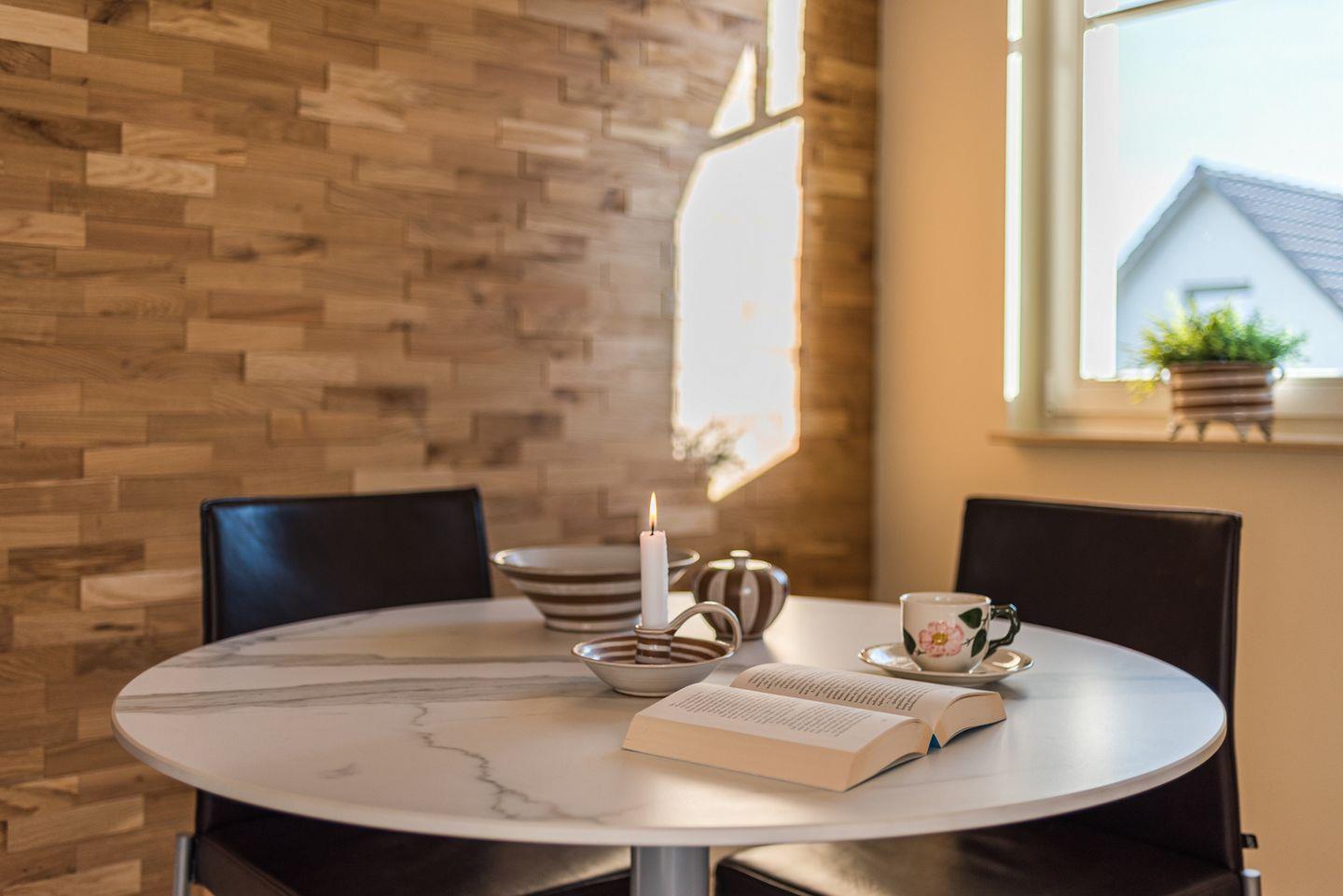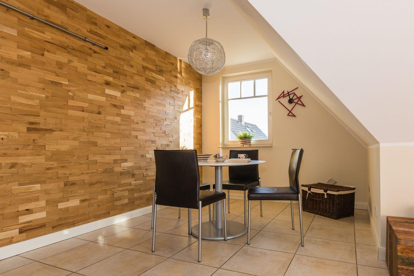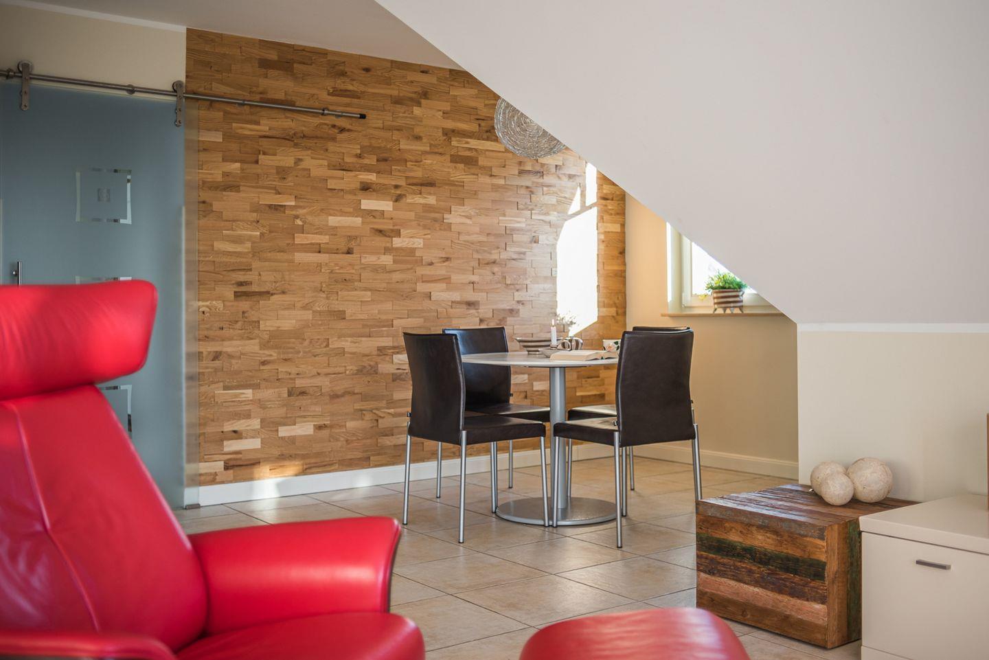 Eine Fußbodenheizung sorgt für Behaglichkeit und eine Glastür trennt den Wohnbereich vom Flur ab.