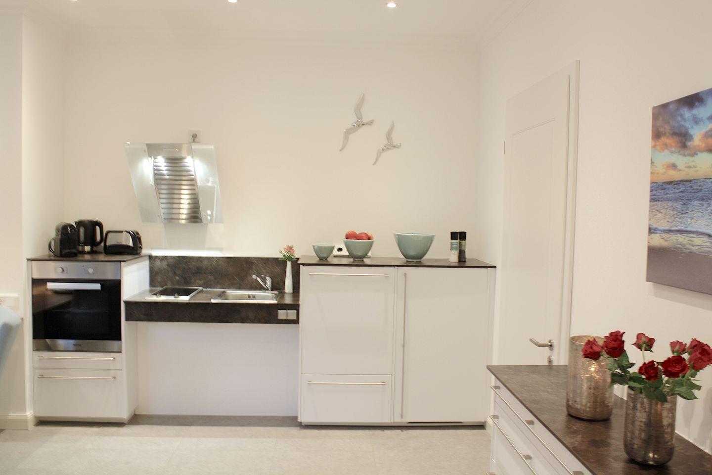 Der hochwertig gestaltete Wohn- und Esszimmerbereich mit Kamin (Elektro), der Blick auf den idyllischen Stranddeich sowie die moderne Einbauküche bieten Ihnen einen hervorragenden Komfort.