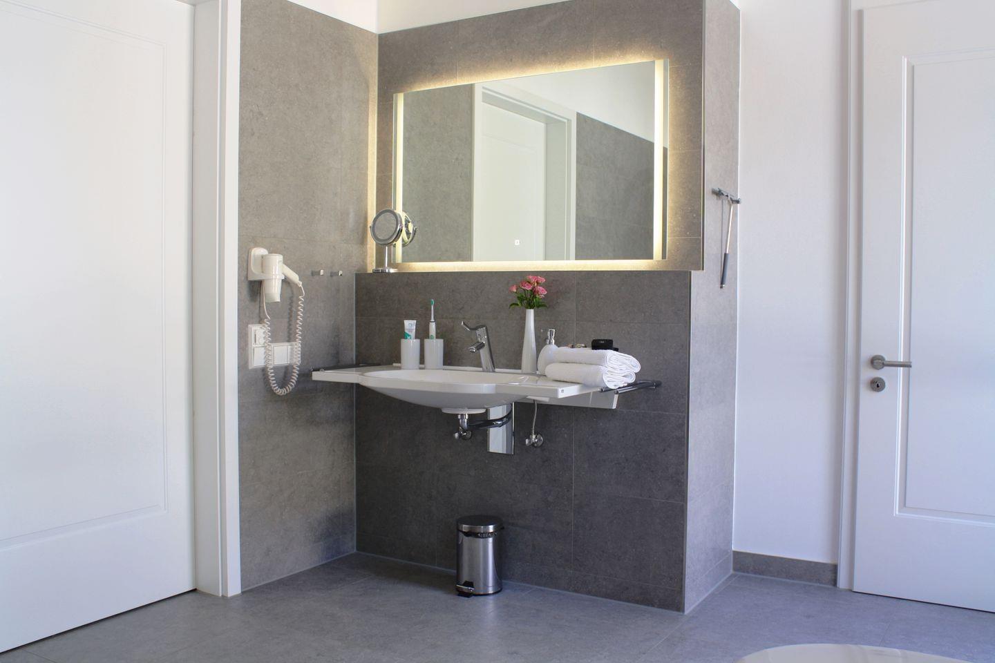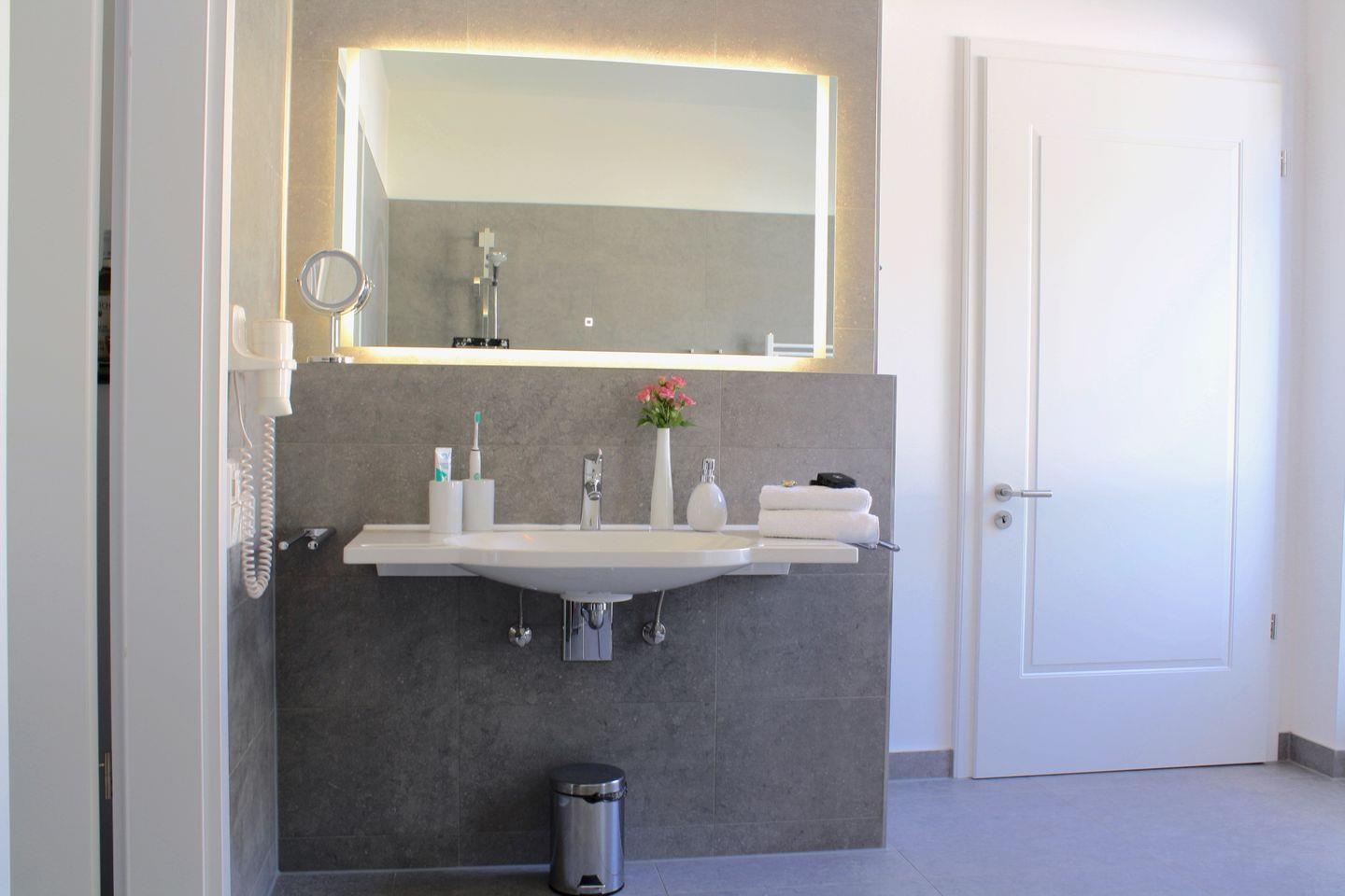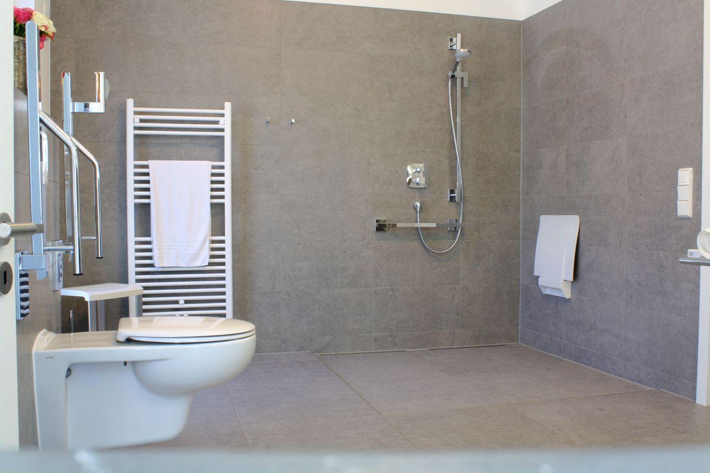 Im geräumigen Badezimmer erwartet Sie eine barrierefreie, ebenerdige Dusche und stilvolles Design.