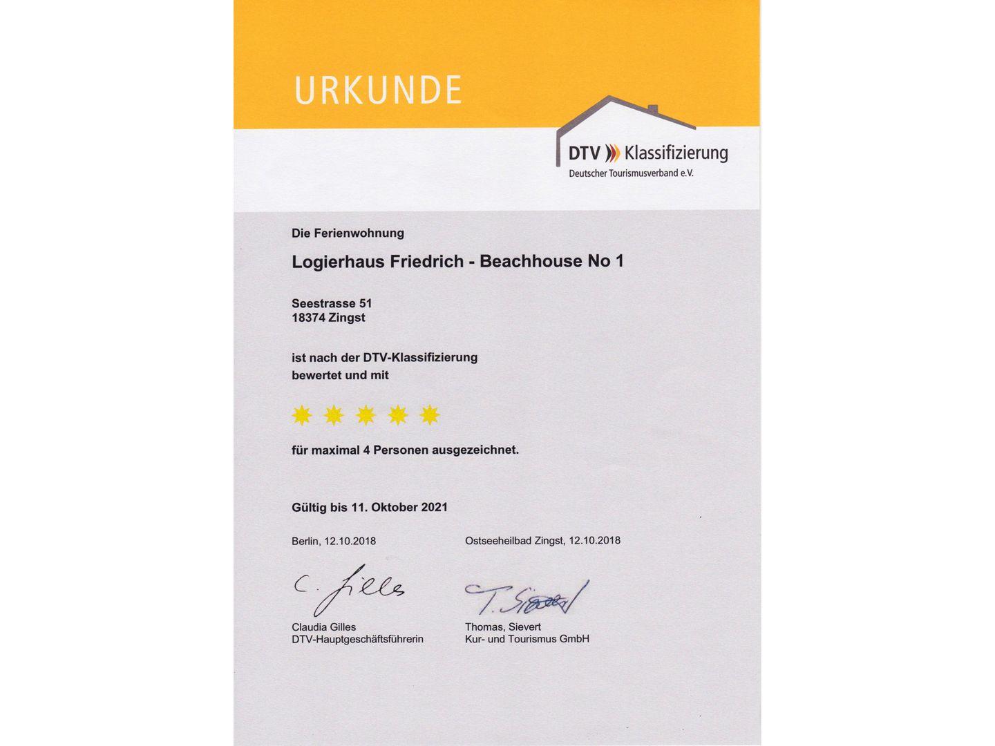 Die exklusive Suite „Beachhouse No.1“ befindet sich im Erdgeschoss des neu errichteten „Logierhaus Friedrich“ und wurde vom „DTV" (Deutscher Tourismusverband) mit 5 Sternen ausgezeichnet.