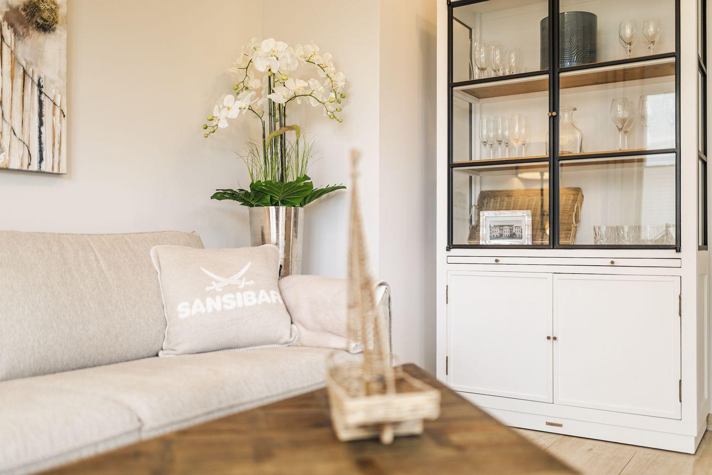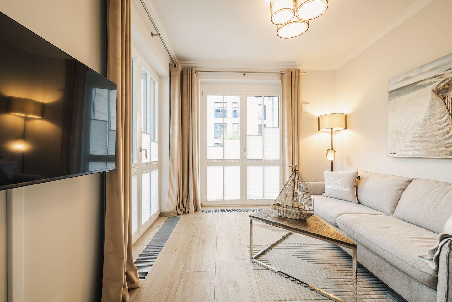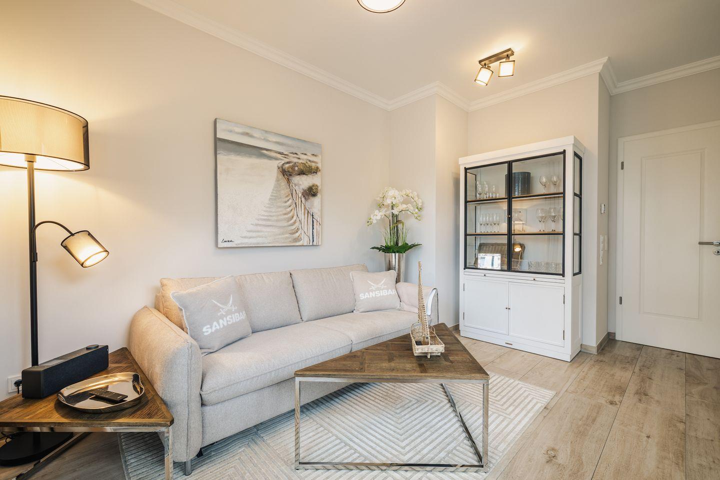 Das Wohnzimmer empfängt Sie mit einem hochwertigen Schlafsofa, einem stilvollen Couchtisch und einer edlen Glasvitrine. Warme Lichtakzente, moderne Kunstwerke und sanfte Sand- und Grautöne verleihen dem Raum eine behagliche, luxuriöse Atmosphäre. Für Unterhaltung sorgen Smart-TV und eine hochwertige Hi-Fi-Anlage.