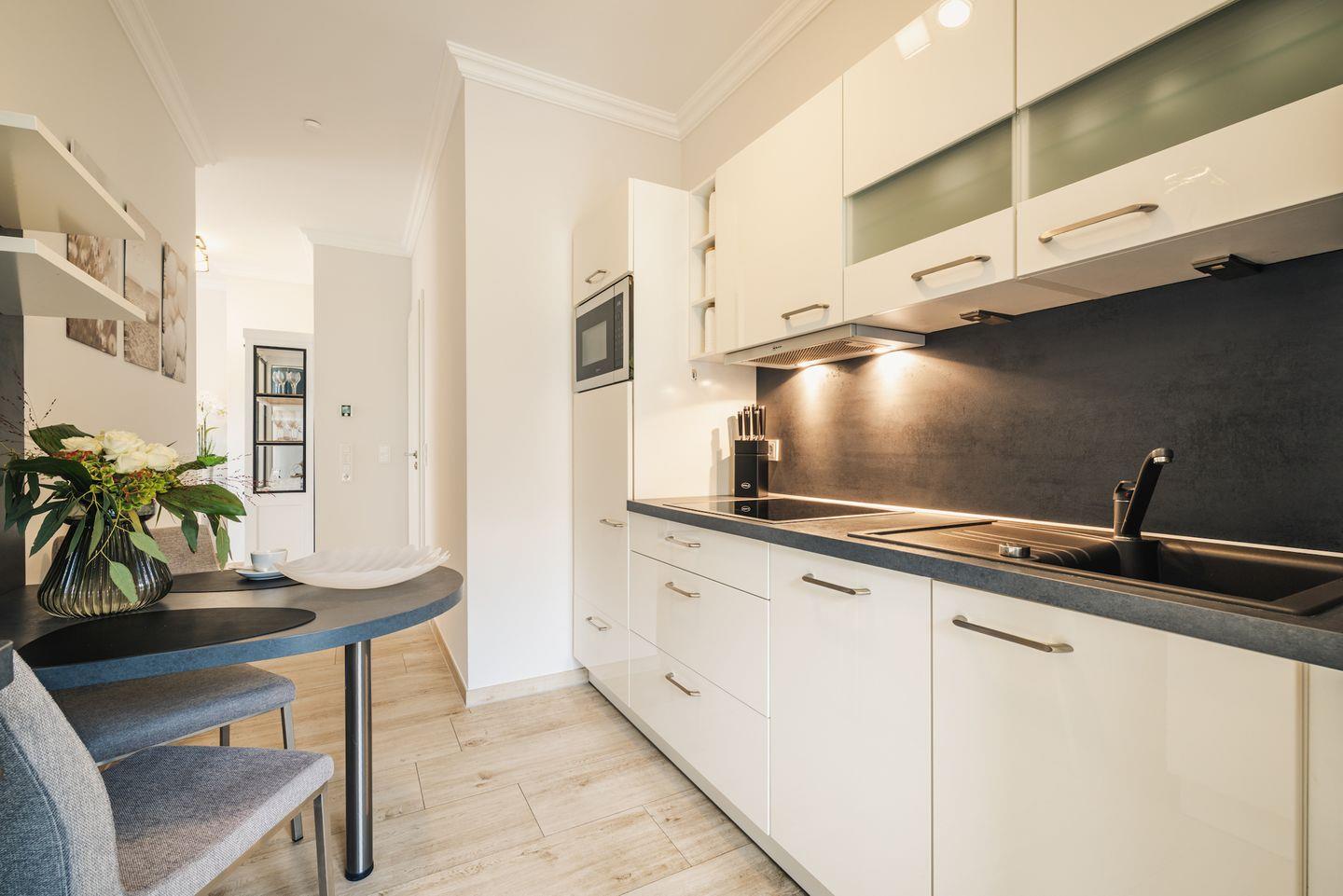 Die offene, weiße Hochglanzküche ist mit Induktionskochfeld, Backofen, Mikrowelle, Spülmaschine und Kühlschrank mit Gefrierfach ausgestattet und lässt keine Wünsche offen. Der angrenzende Essplatz lädt zum Genießen und Verweilen ein.