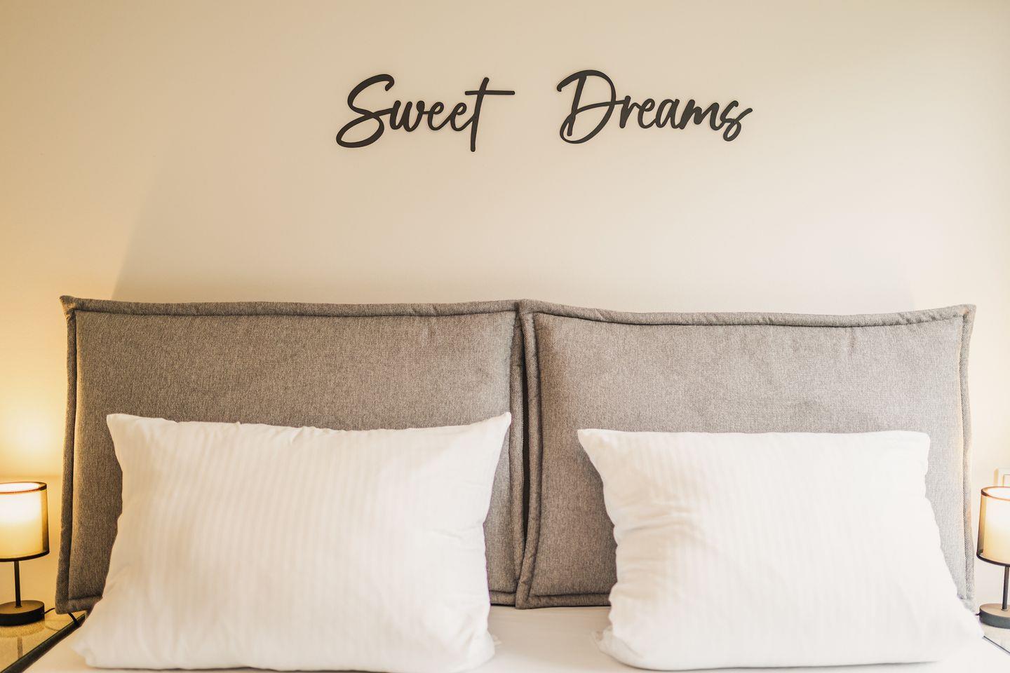 Im Schlafzimmer verspricht das neue Boxspringbett mit hochwertiger Bettwäsche erholsame Nächte. Edle Nachttische, ein Schminktisch mit Spiegel sowie ein zweiter Flachbildfernseher runden das exklusive Ensemble ab.