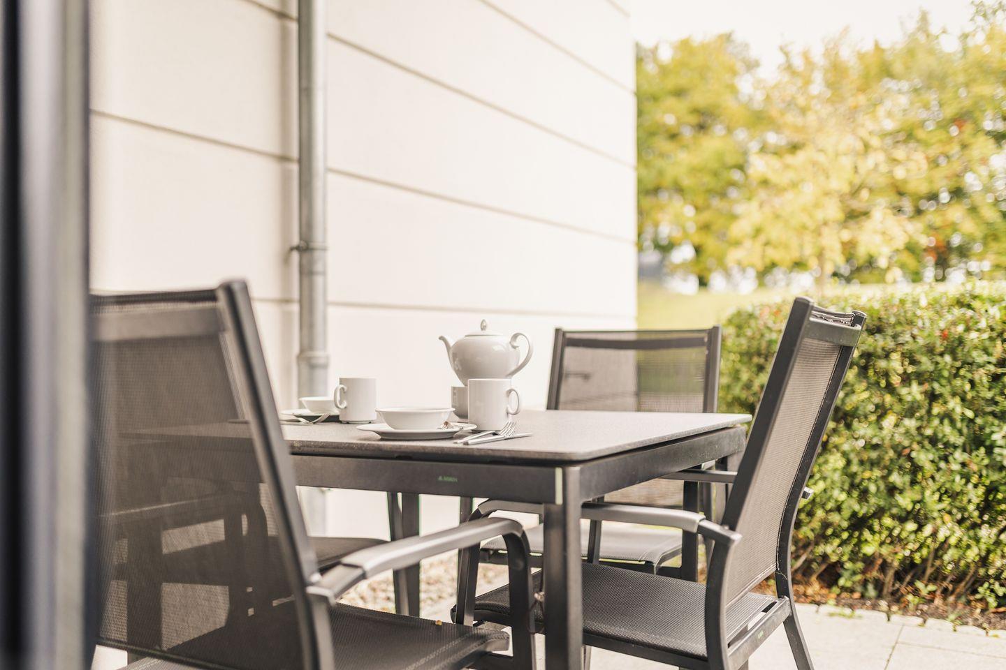 Auf der geschützten Terrasse mit Gartenmöbeln können Sie den Tag bei einer frischen Meeresbrise ausklingen lassen. Durch die unmittelbare Nähe zur Ostsee hören Sie hier das sanfte Rauschen der Wellen.