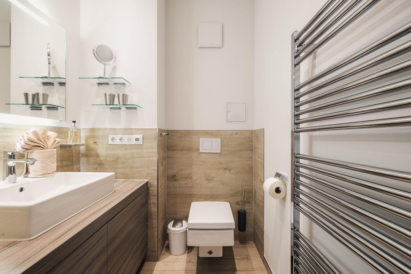 Das moderne Bad besticht durch luxuriöse Ausstattung mit ebenerdiger Regendusche, beleuchtetem Schminkspiegel, integriertem Radio und verchromtem, beheizbarem Handtuchhalter.