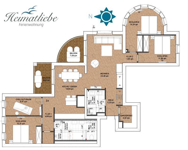 Das Appartement 7 "Heimatliebe", das sich in der ersten Etage befindet, bietet modern und offen gestaltete 132 m² Wohnfläche für anspruchsvolle Genießer.