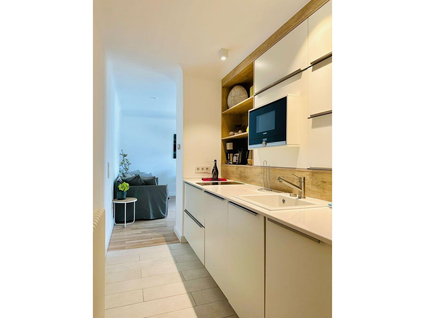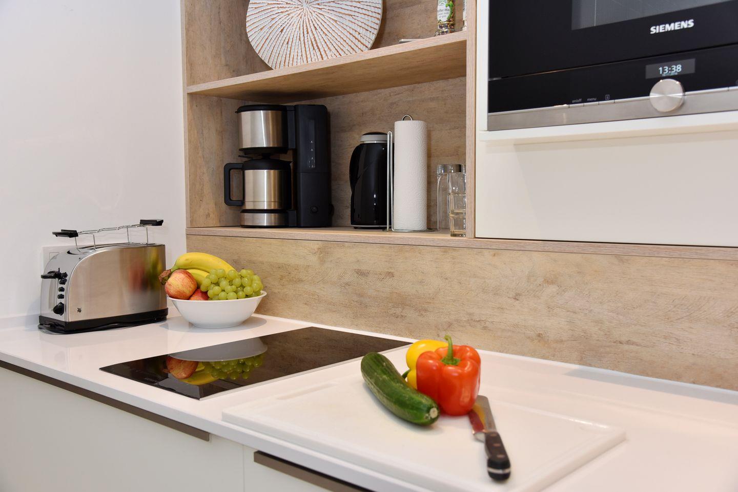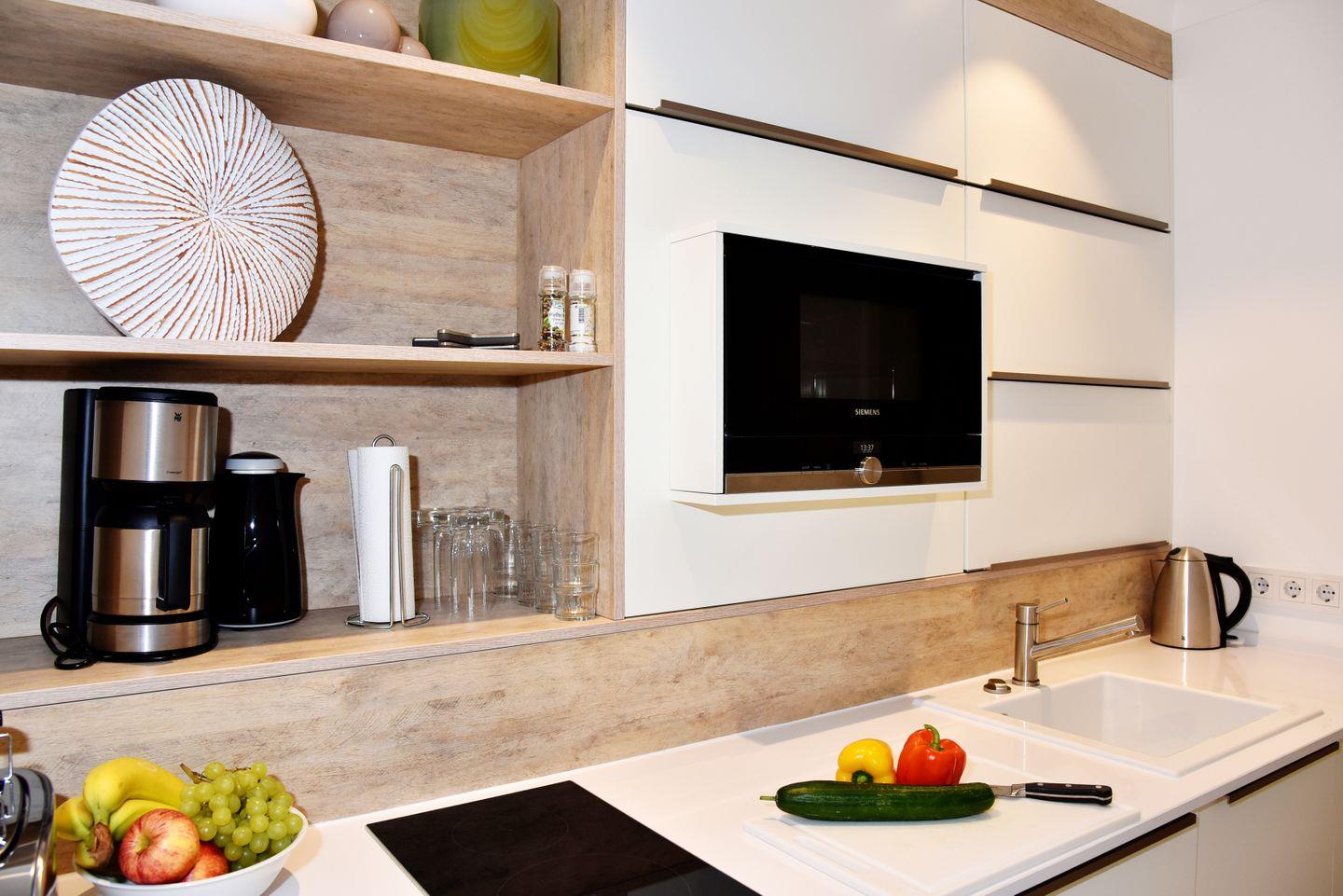Die moderne Küchenzeile in Hochglanzoptik ist umfangreich ausgestattet und lädt zum Kochen ein.