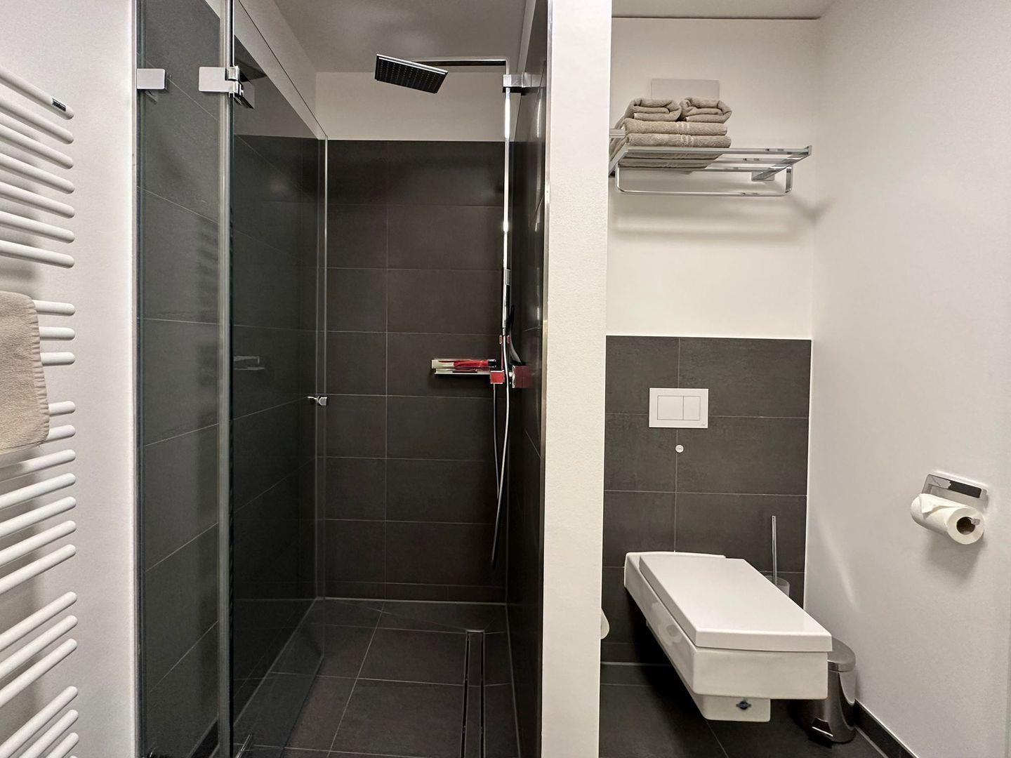 Das Badezimmer ist mit einer ebenerdigen Glasdusche mit Regenduschkopf versehen und das breite Doppelwaschbecken bietet viel Platz.