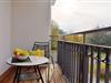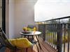 Vom Wohnbereich gelangt man auf den möblierten Westbalkon mit Sonnenschirm und Blick bis zum Kurpark.