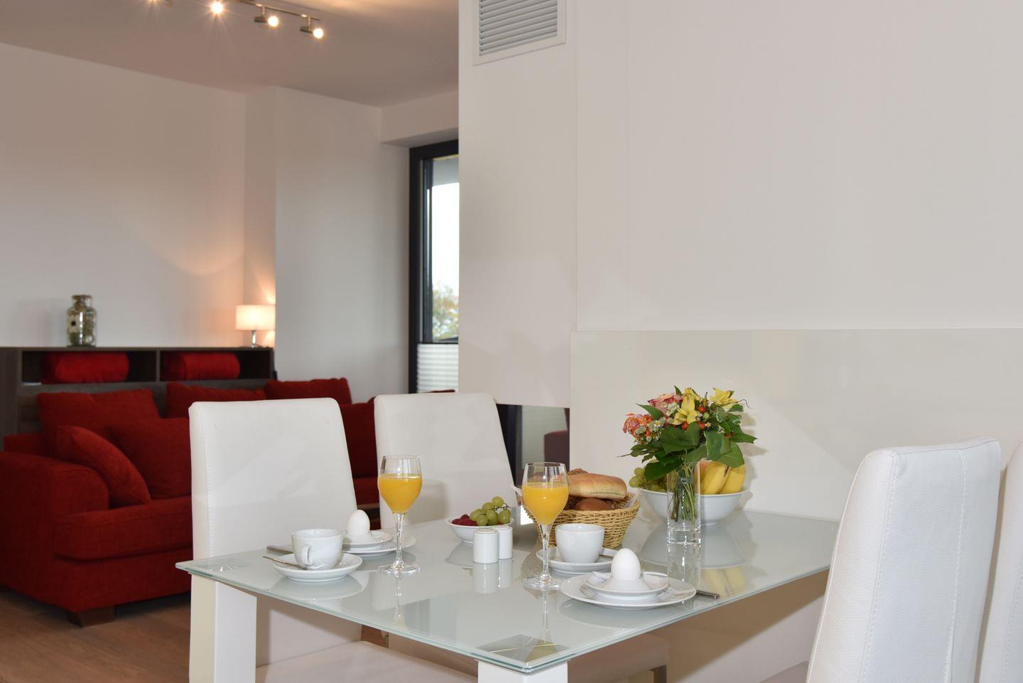 Zur Suite gehört eine neu ausgestattete Küchenzeile, ein Bad mit ebenerdiger Dusche und 2 Schlafzimmer mit Boxspringbetten.