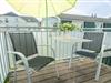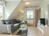 Die Wohnung liegt in der 1. Etage, hier finden Sie den hellen Wohnbereich mit der integrierten Küchenzeile und dem Zugang zum möblierten Westbalkon.