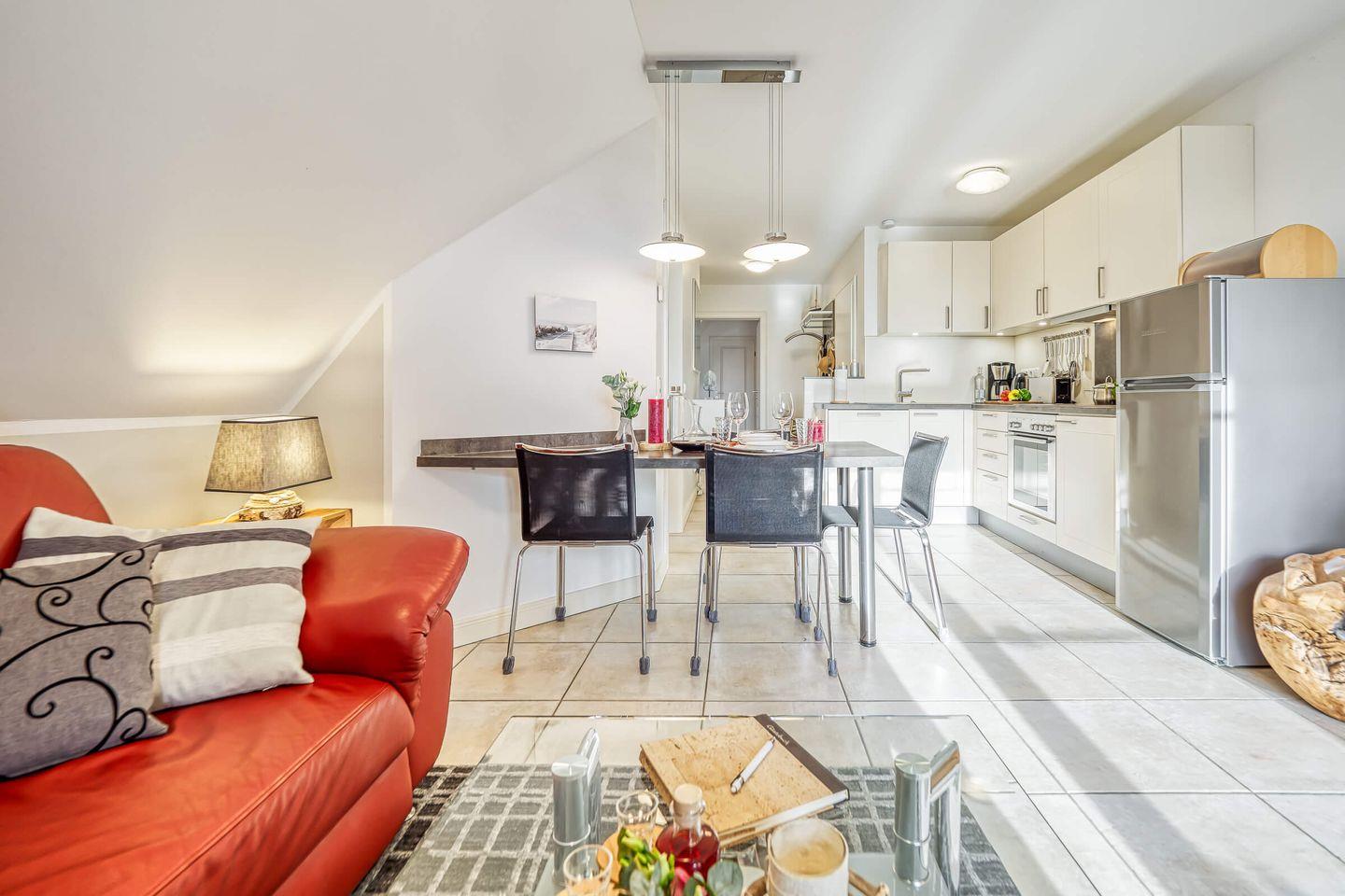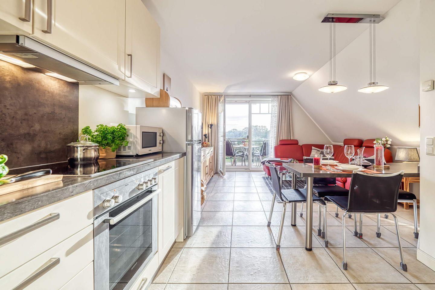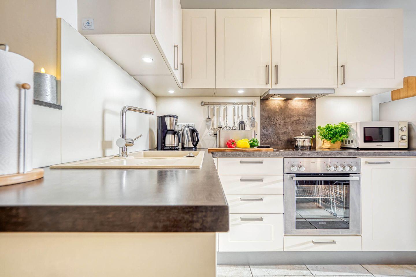 Eine hochwertige und komfortabel eingerichtete Ferienwohnung für 1-4 Personen verfügt über eine Einbauküche mit Geschirrspüler, Elektroherd und weiteren elektrischen Geräten, sowie LED-TV + DVD-Player und gemütlichem Sofa im integrierten Wohnzimmer.