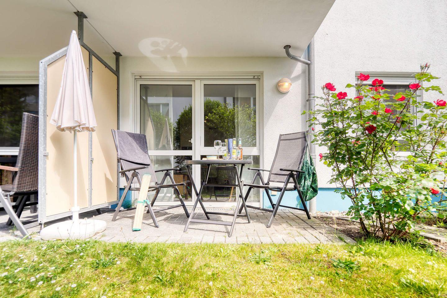 Die helle und modern gestaltete Wohnung verfügt über einen Wohnraum mit offener Küche und Essbereich, ein separates Schlafzimmer, ein Badezimmer sowie eine Terrasse.