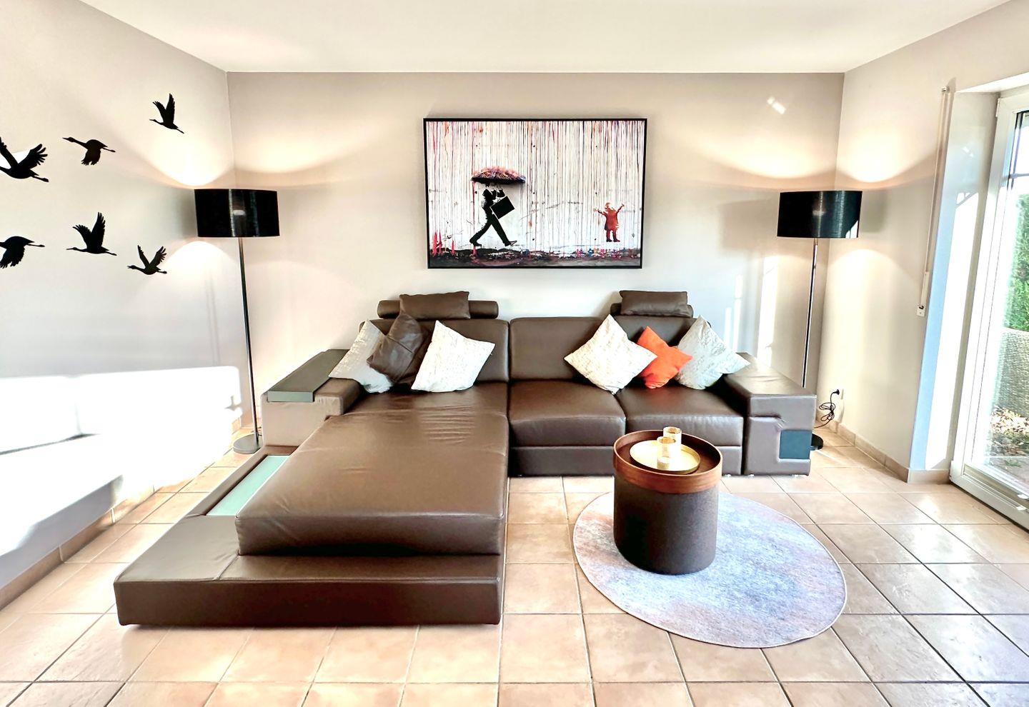 Im Wohnbereich steht eine gemütliche Sofa-Landschaft. Medienentertainment bietet der große Smart-TV und ein Bluetooth-Lautsprecher. W-LAN ist kostenlos über den Hot-Spot-Anschluss (Anmeldung erforderlich).