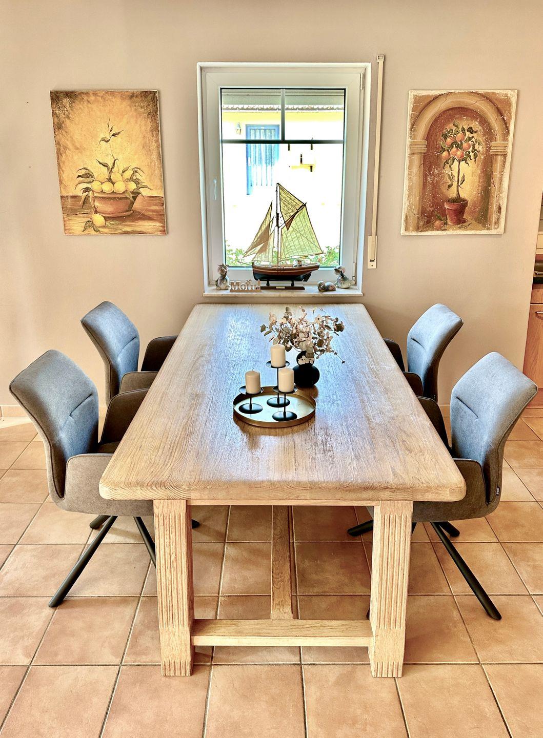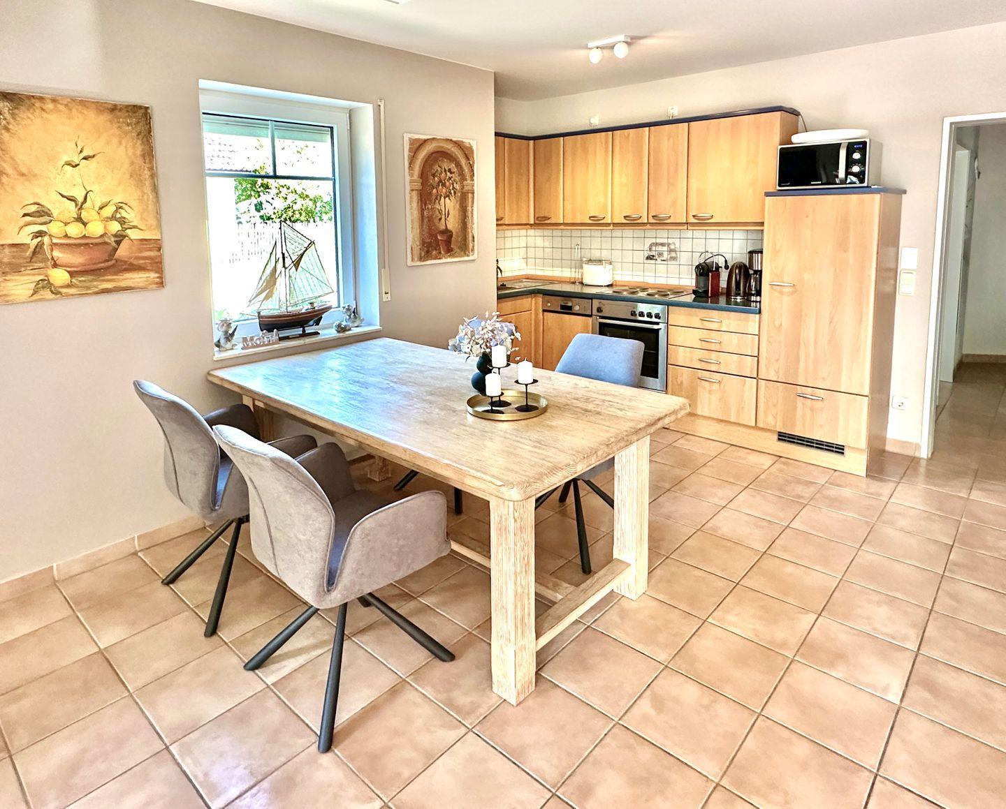 Die Küchenzeile ist ausgestattet mit einem großen Kühlschrank, Herd und Backofen, Dunstabzugshaube, Spülmaschine, Kaffeemaschine, Wasserkocher, Mikrowelle, Toaster, Tischgrill (dieser darf nur auf der Terrasse benutzt werden).