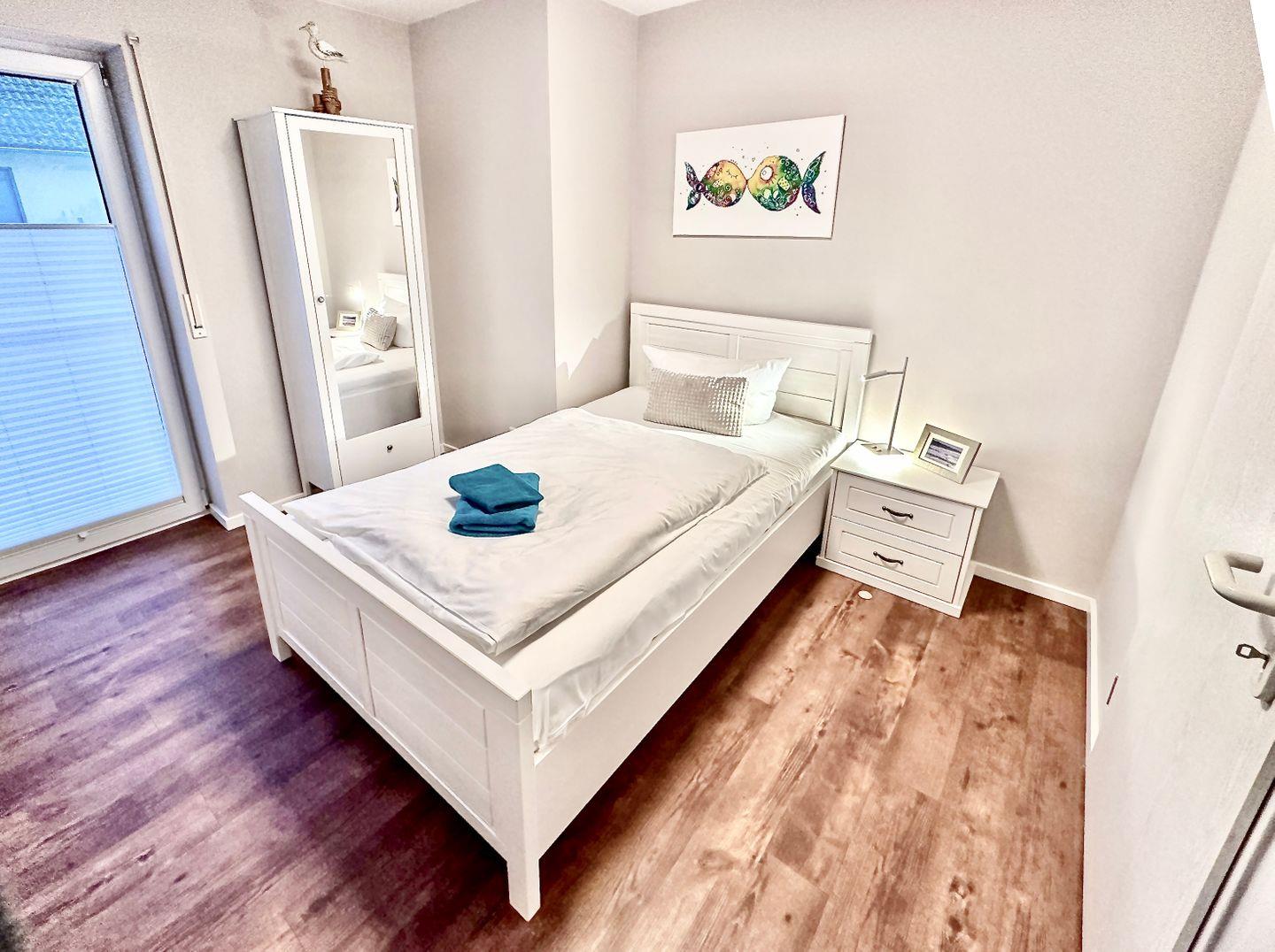 Schlafzimmer 2: Einzelbett (1,20 x 2,00 m) Ein kleiner Kleiderschrank.