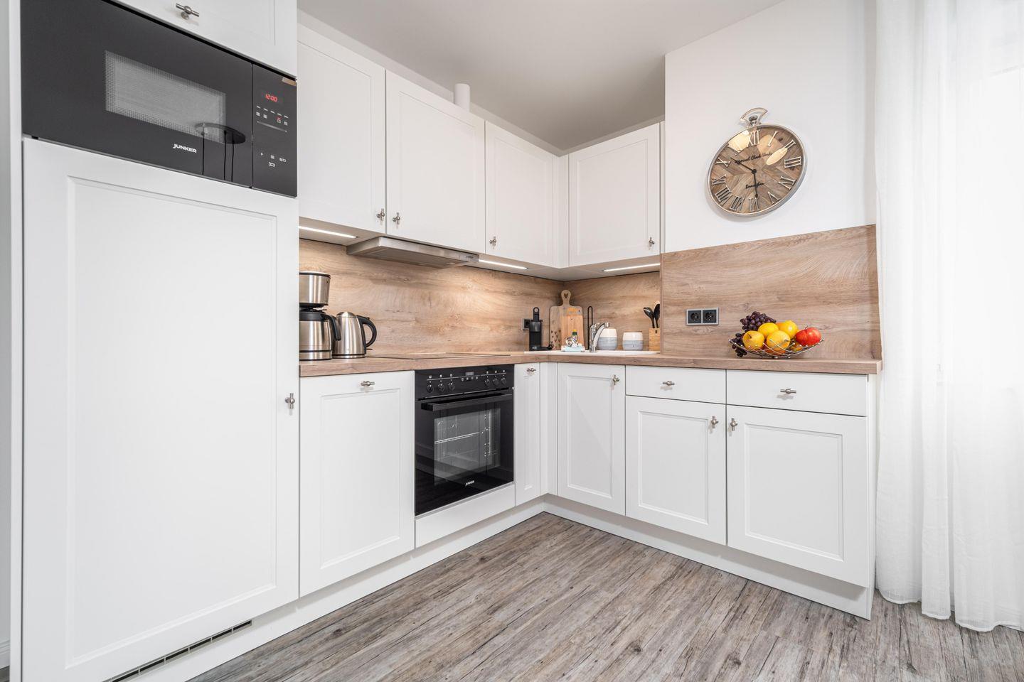 Die über Eck verbaute, gut ausgestattete Einbauküche mit Geschirrspüler, Elektroherd, Mikrowelle und weiteren technischen Geräten lädt zum Kochen mit der ganzen Familie ein.