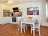 Das Wohnzimmer mit bequemer Sofaecke ist hell und gemütlich und schließt an die moderne offene Küche mit Essbereich an. Die Küche selbst bietet Kühlschrank, Backofen, Mikrowelle, Cerankochfeld, Kaffeemaschine und Geschirrspüler. Hier kann man sich ganz zu Hause fühlen.