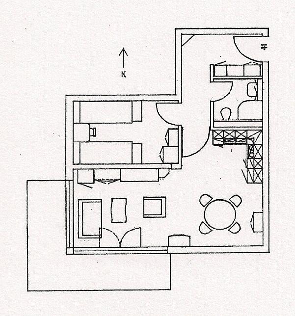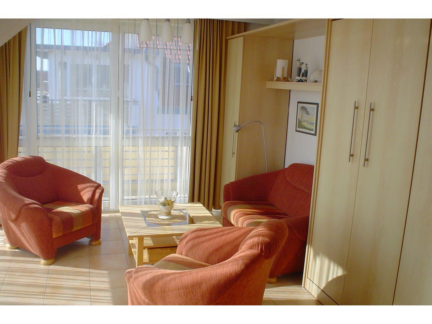 Im Wohnzimmer befindet sich eine gemütliche Sitzecke und ein Schrankbett (Doppelbett 1,80 m x 2,00 m), sowie die Küchenzeile mit Esstisch.
