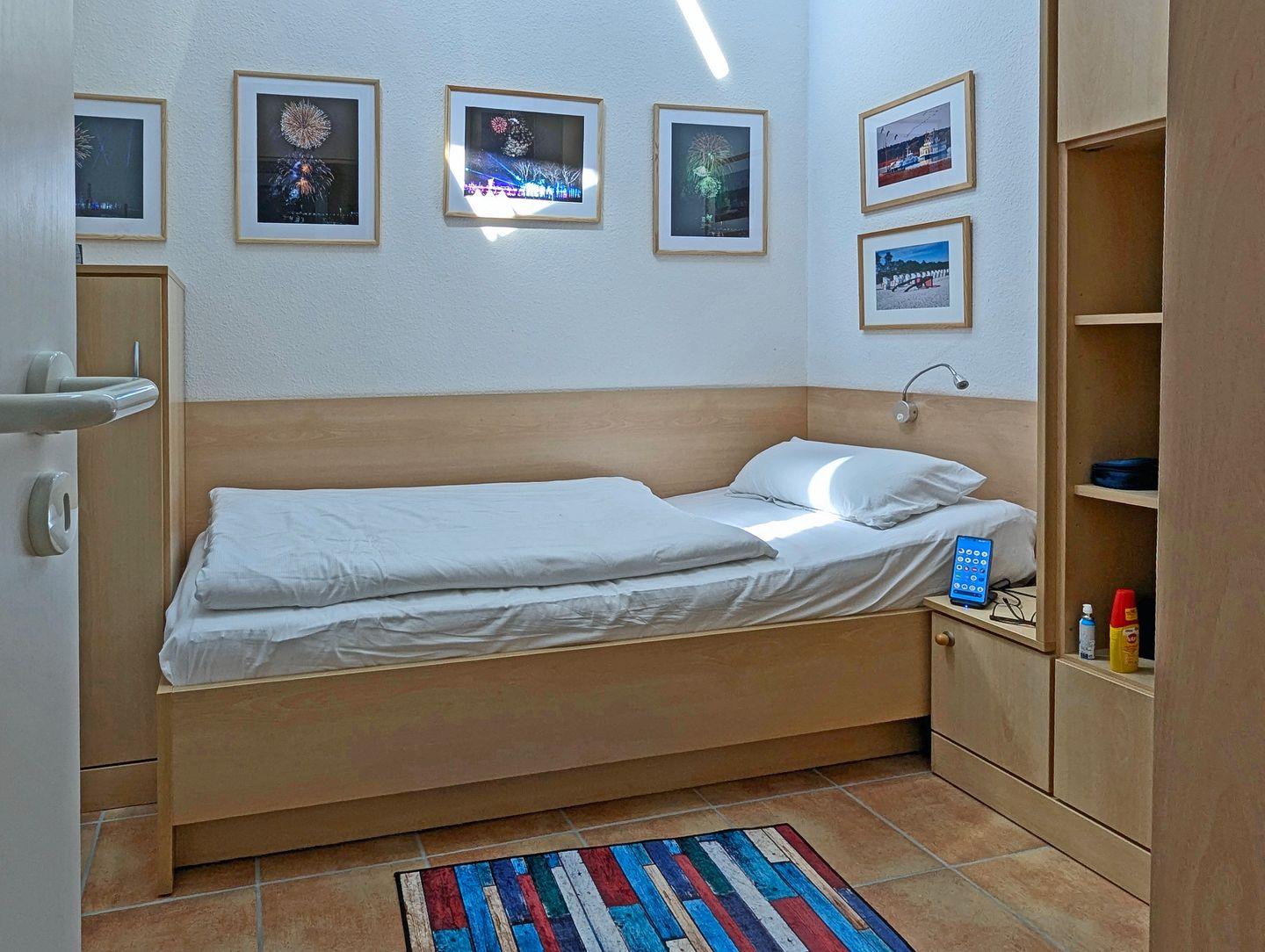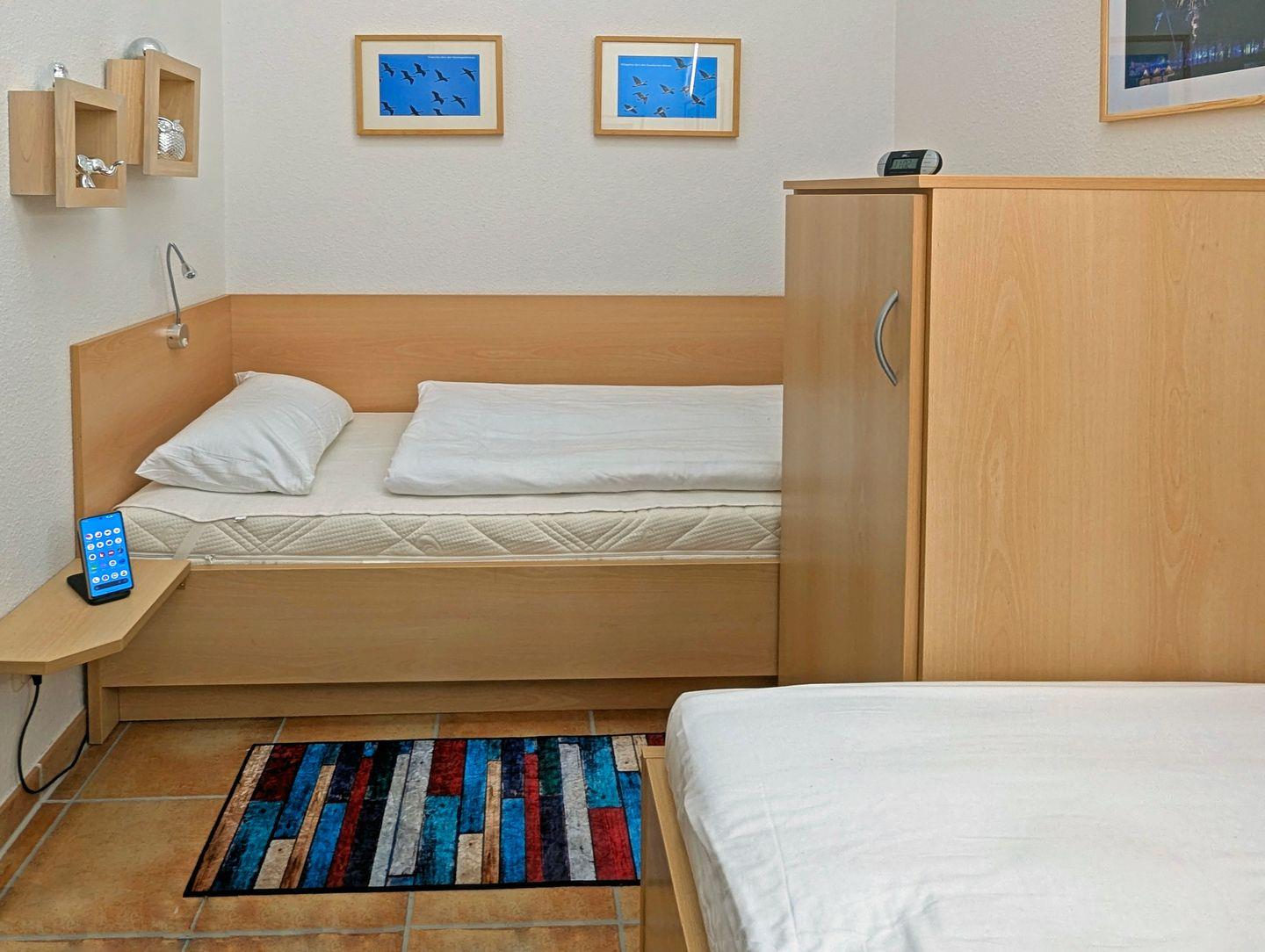 Im Schlafraum mit elektrisch betriebenem Oberlichtfenster sind zwei Einzelbetten (1,90 x 0,90 m und 2,00 x 0,90 m) sowie reichlich Stauraum in Einbauschränken vorhanden.
