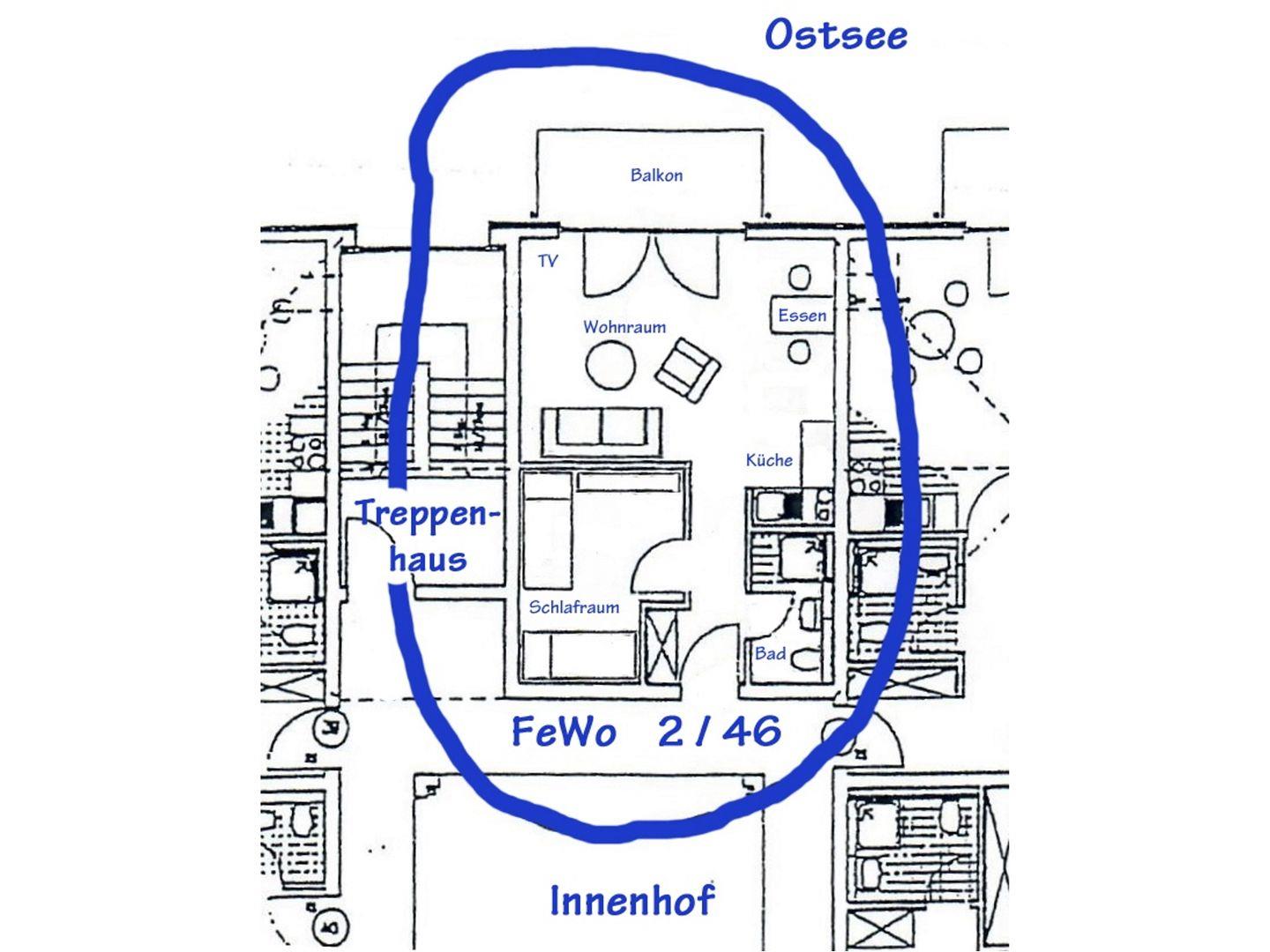 Die Wohnung 2-46 in der „Residenz am Strand“ hat direkten Meerblick. Die Wohnungsgröße liegt bei 36 m².