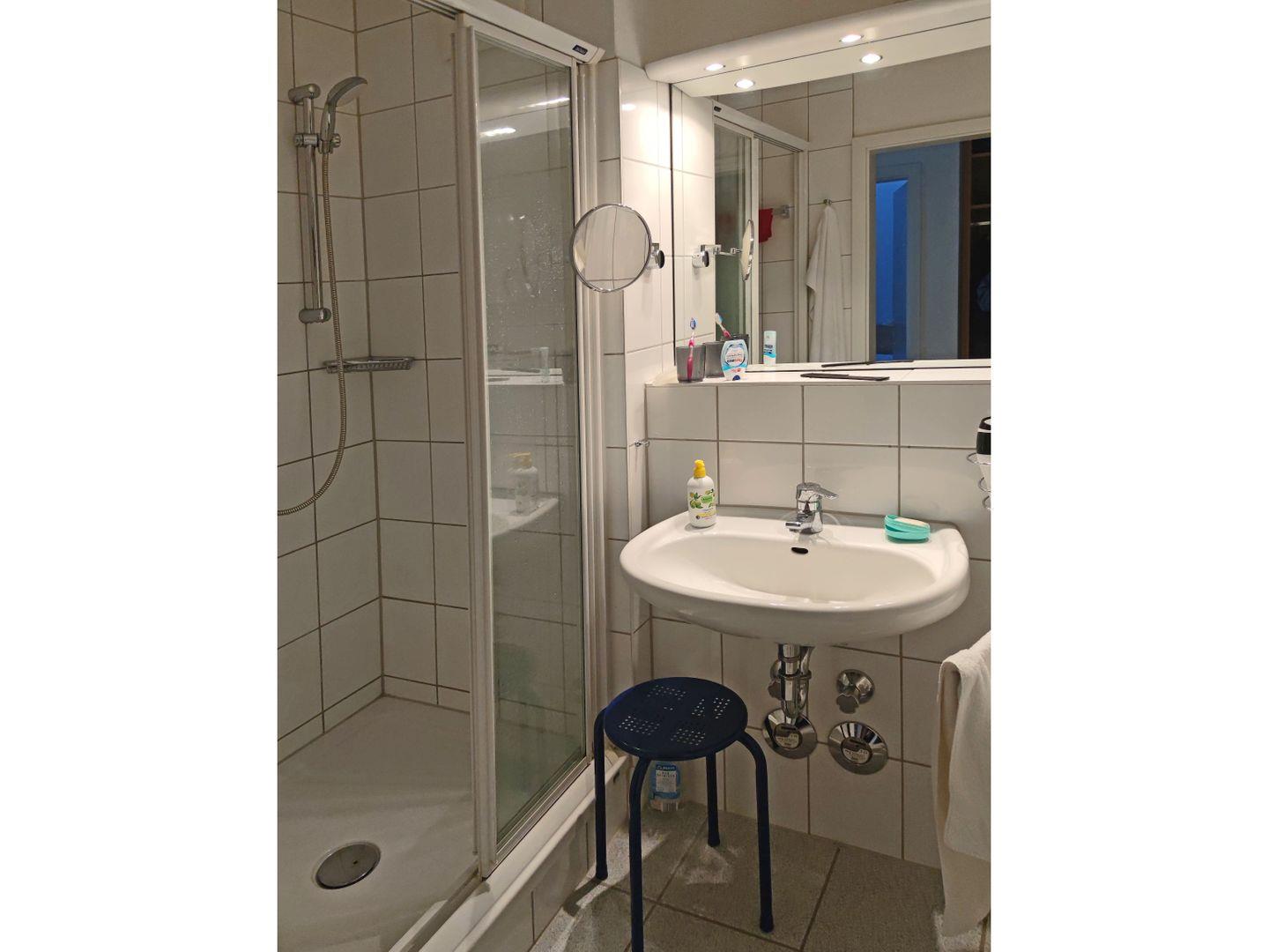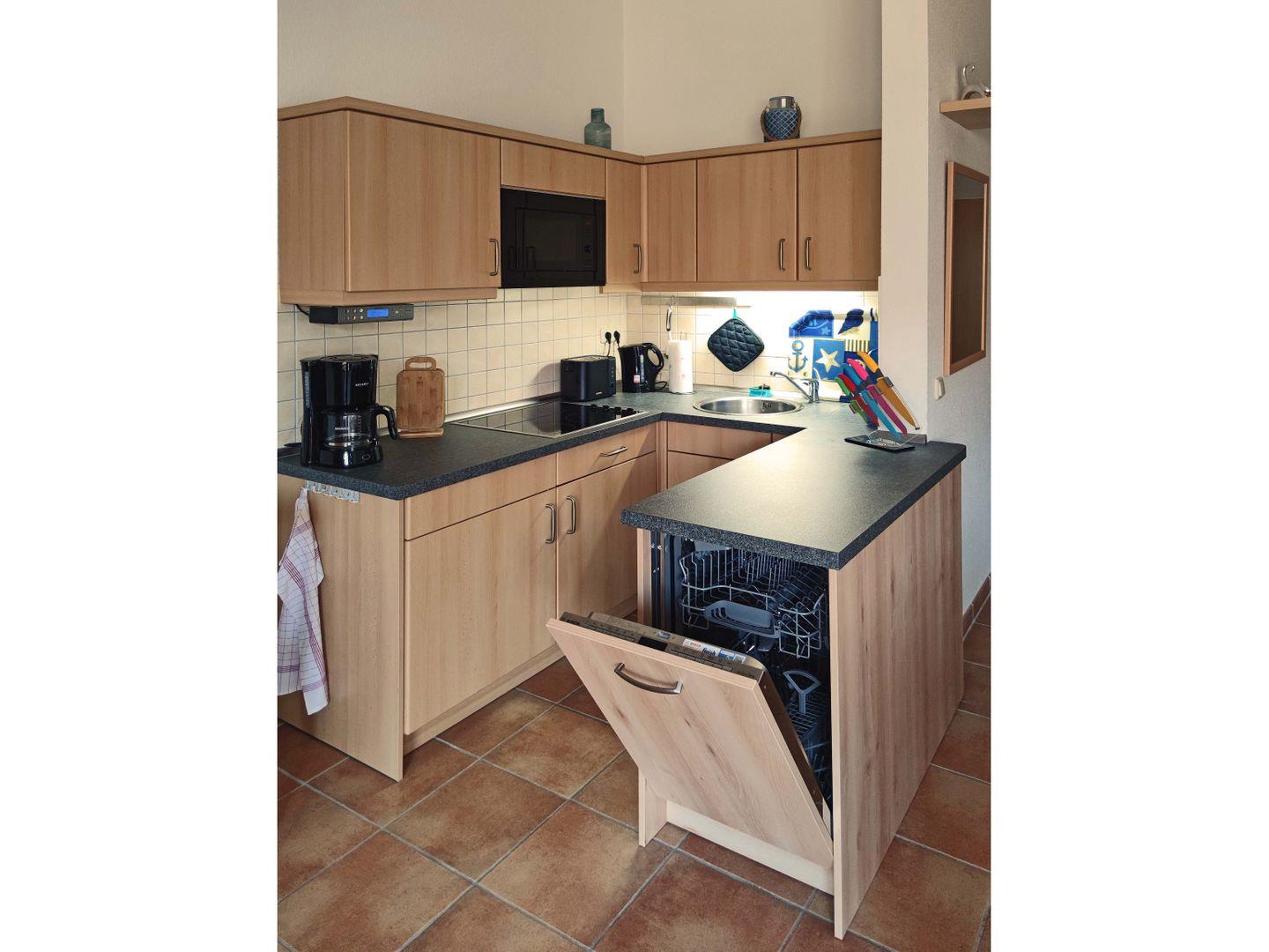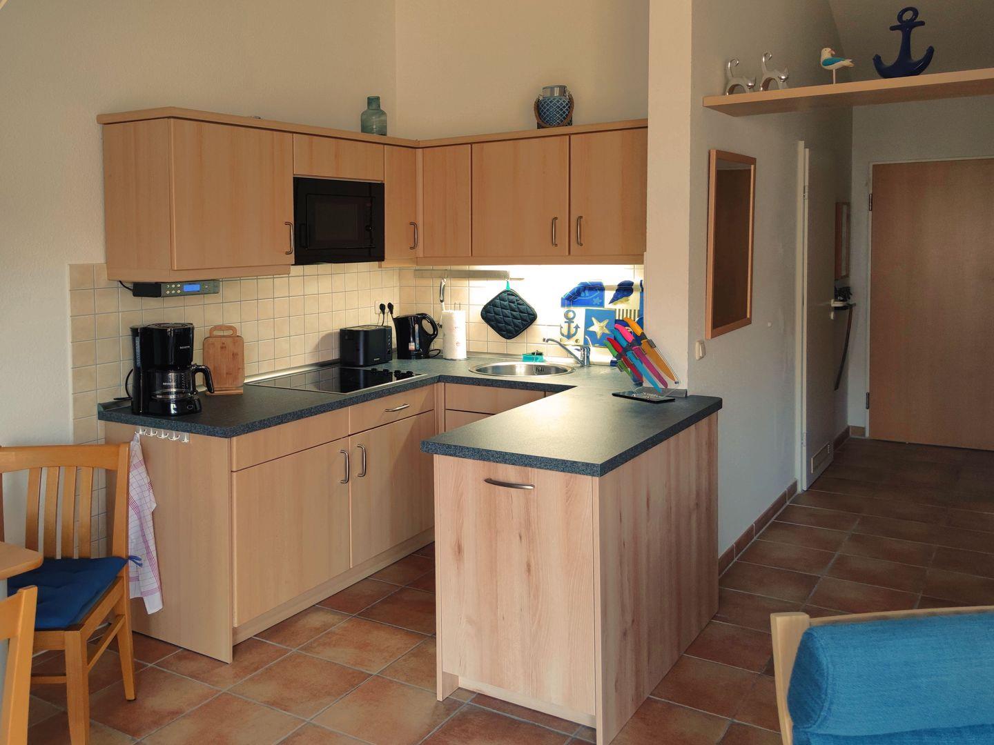 Es ist eine Zweizimmerwohnung welche neben dem großen Wohnraum mit Essbereich (4 Stühle) über eine moderne Küchenzeile mit Ceranfeldern und Mikrowelle verfügt.