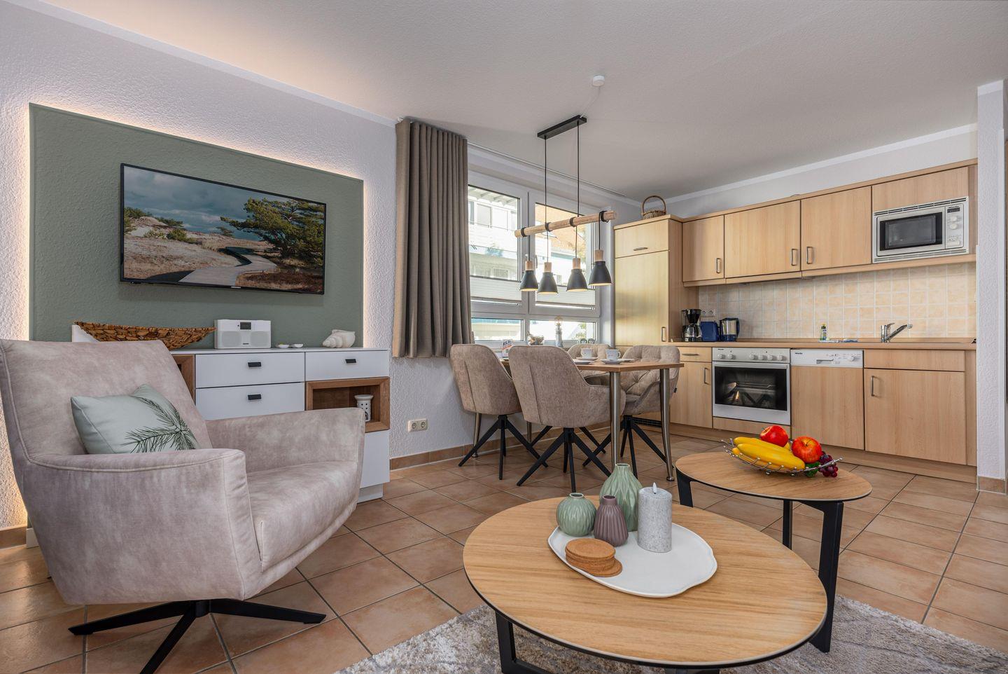 Die große, gemütlich eingerichtete Ferienwohnung liegt im 1. OG bietet Ihnen einen offenen Wohnbereich mit integrierter Küche, welche mit allen elektrischen Geräten und Zubehör ausgestattet ist.