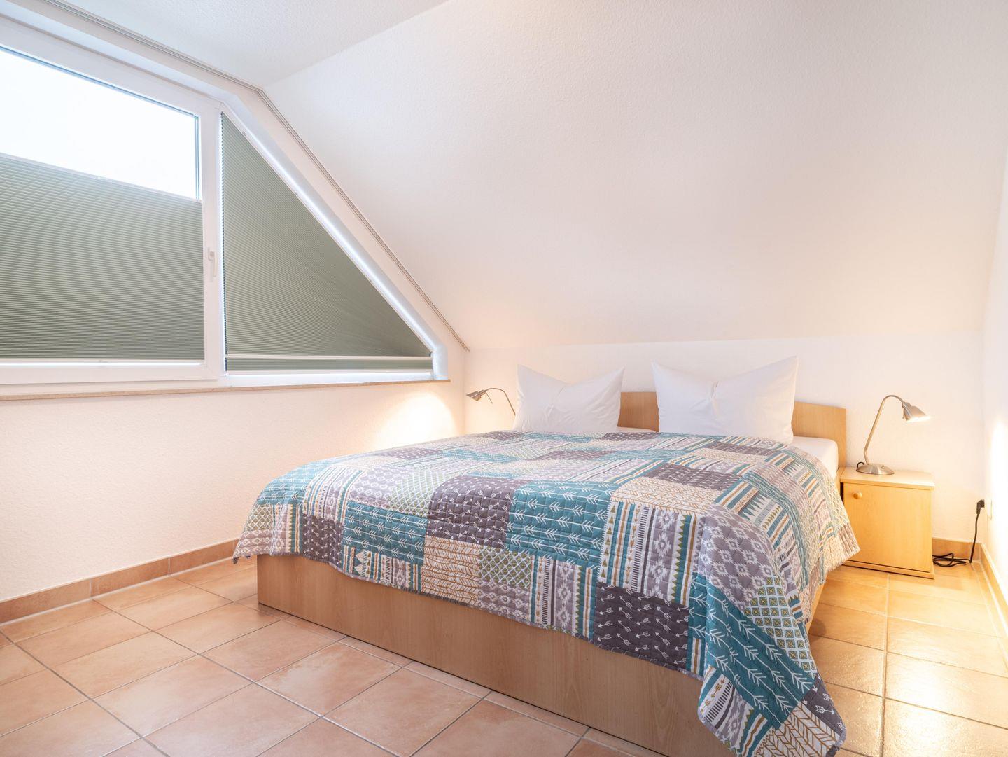 Ein Schlafzimmer mit Doppelbett und ein weiteres mit zwei Einzelbetten und das Badezimmer mit WC und Dusche befinden sich ebenfalls hier.