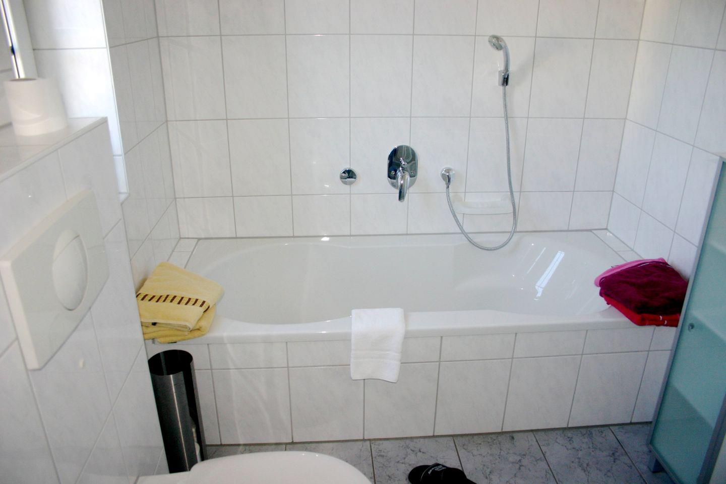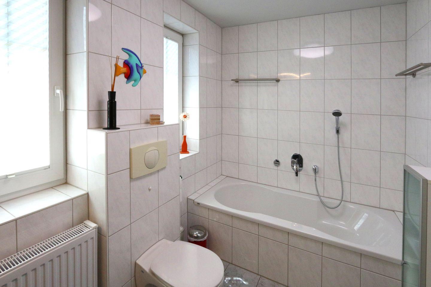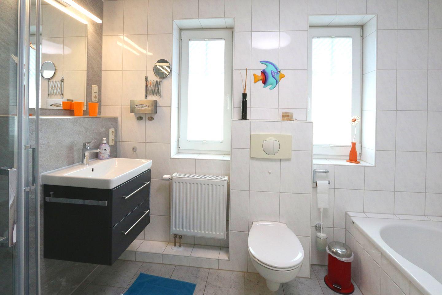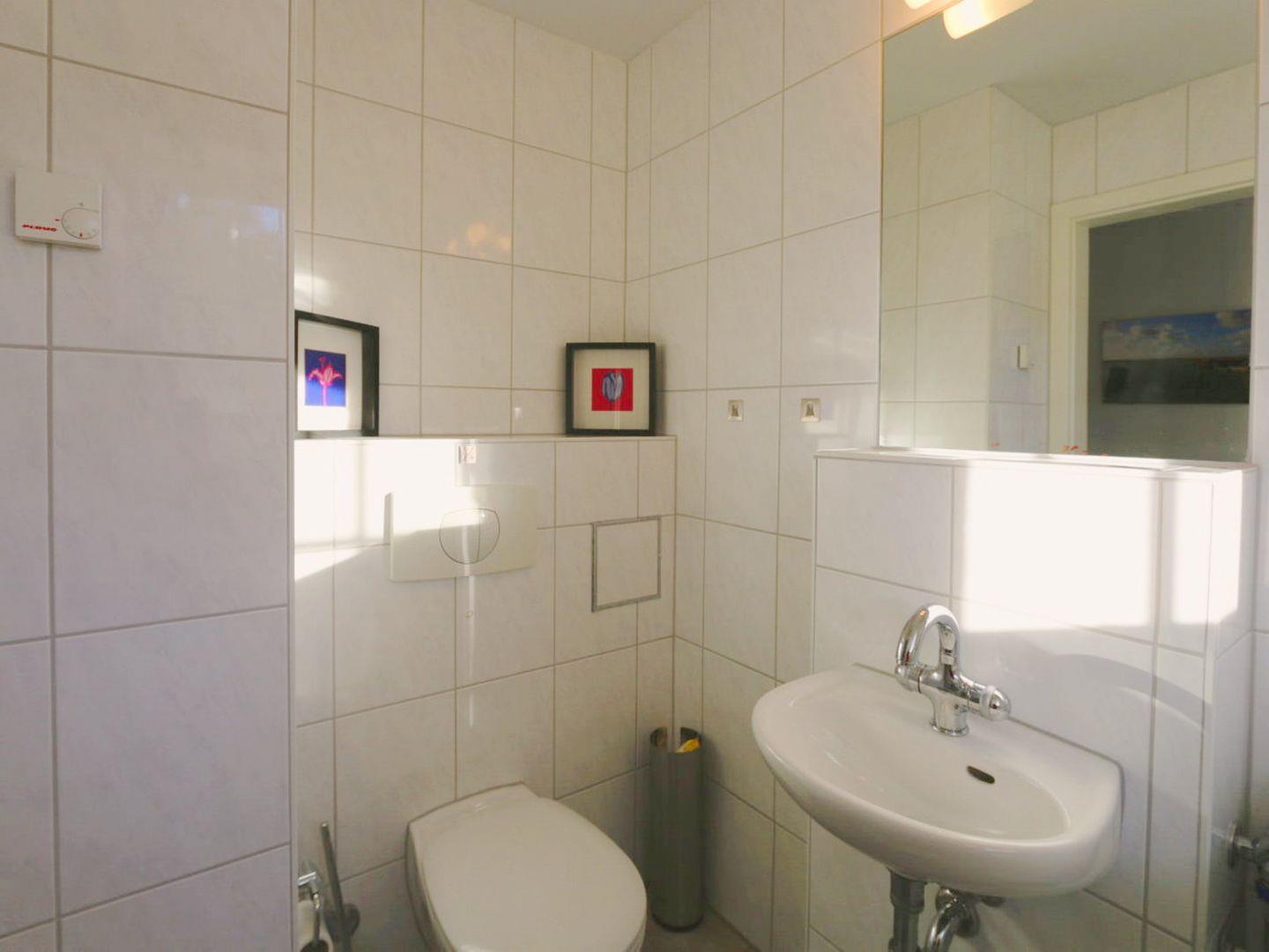 Bad mit Dusche/Wanne/WC, ein Gäste-WC mit Waschmaschine sowie Garderobe und Abstellkammer.