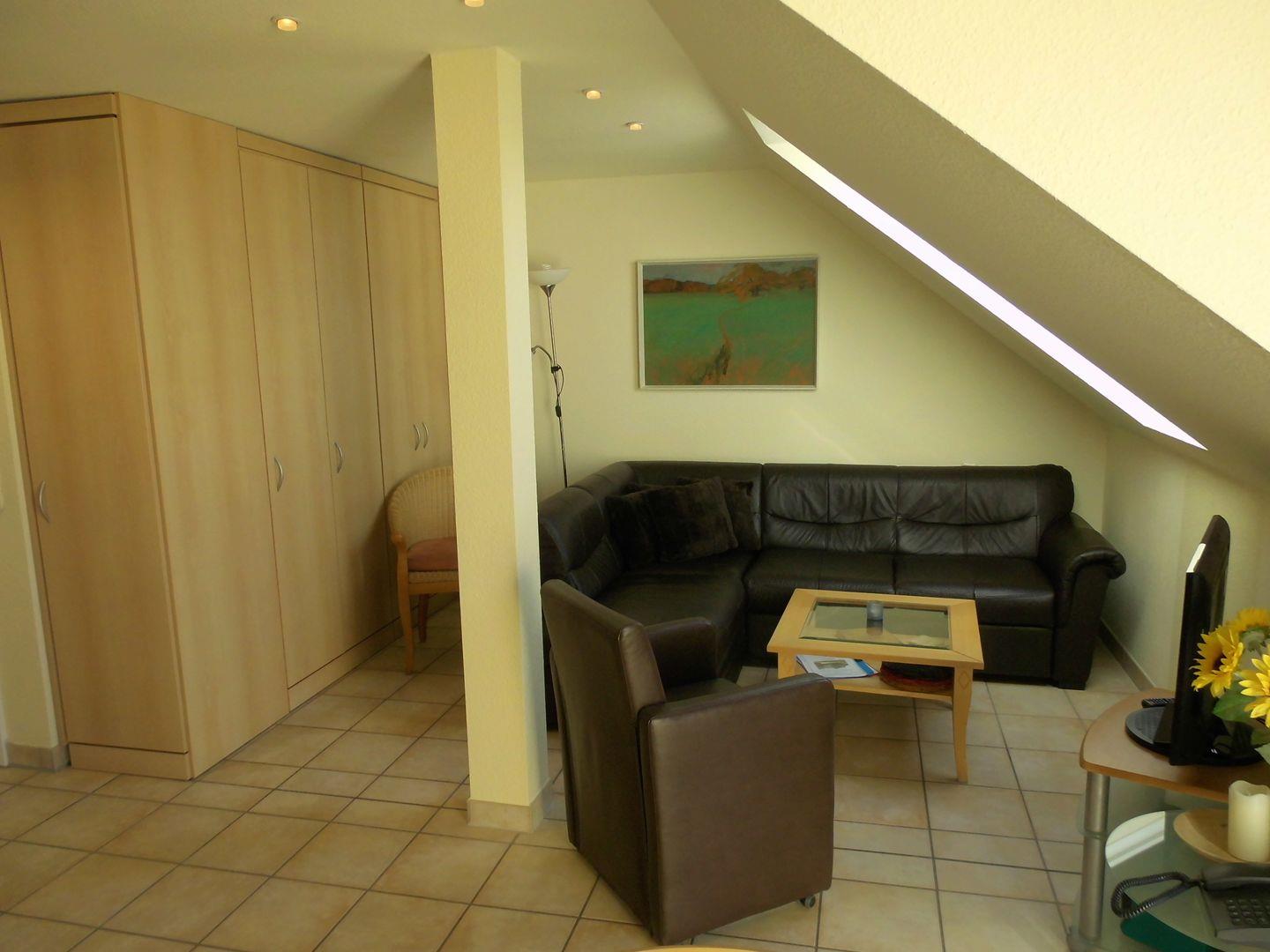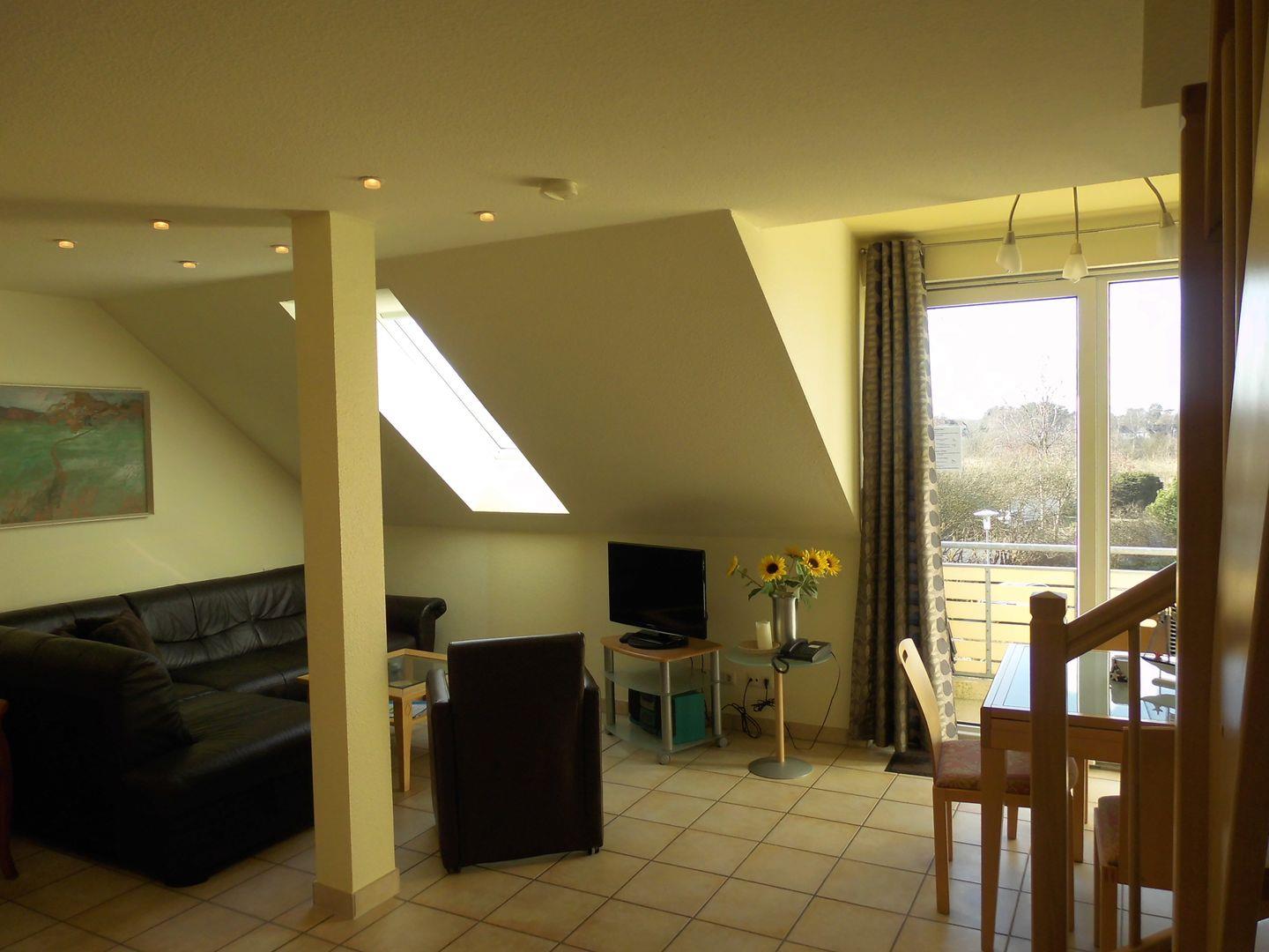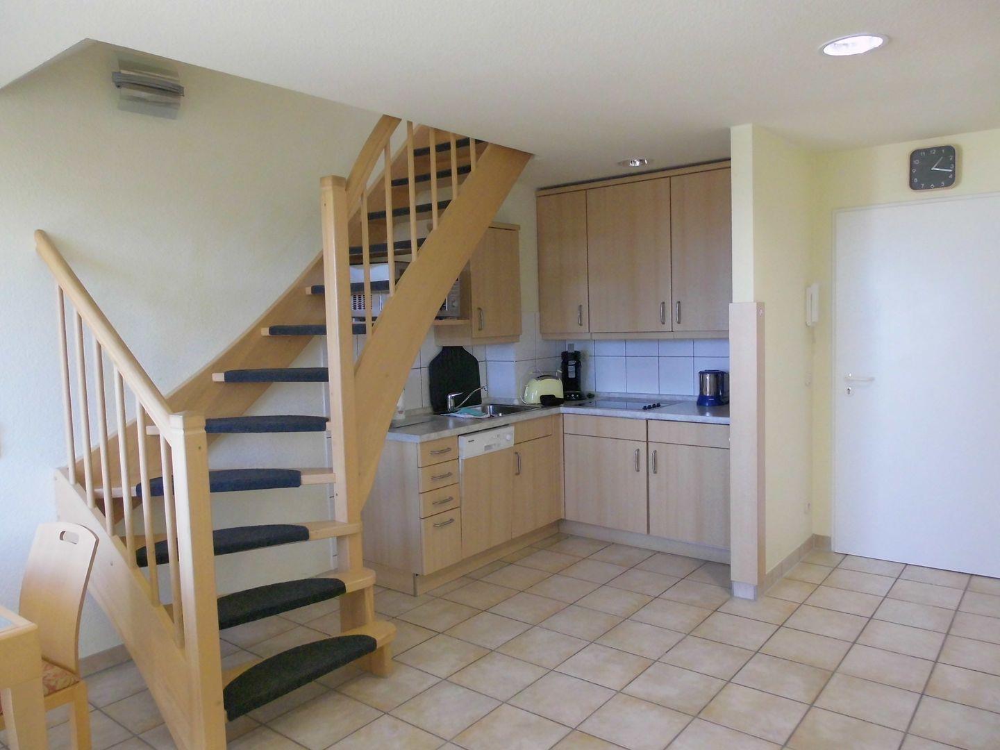 Die Ferienwohnung ist ca. 42 m² groß und hat auf der unteren Etage einen Wohnraum mit Telefon, LED-Fernseher (Sat), Stereoanlage sowie eine integrierte und sehr gut ausgestattete Küche.