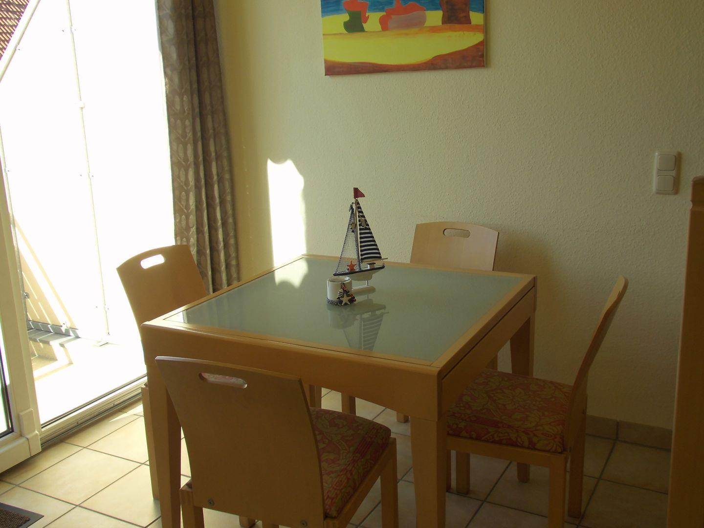 Ein Balkon in westlicher Richtung lädt mit seinen Gartenmöbel zum Verweilen ein.