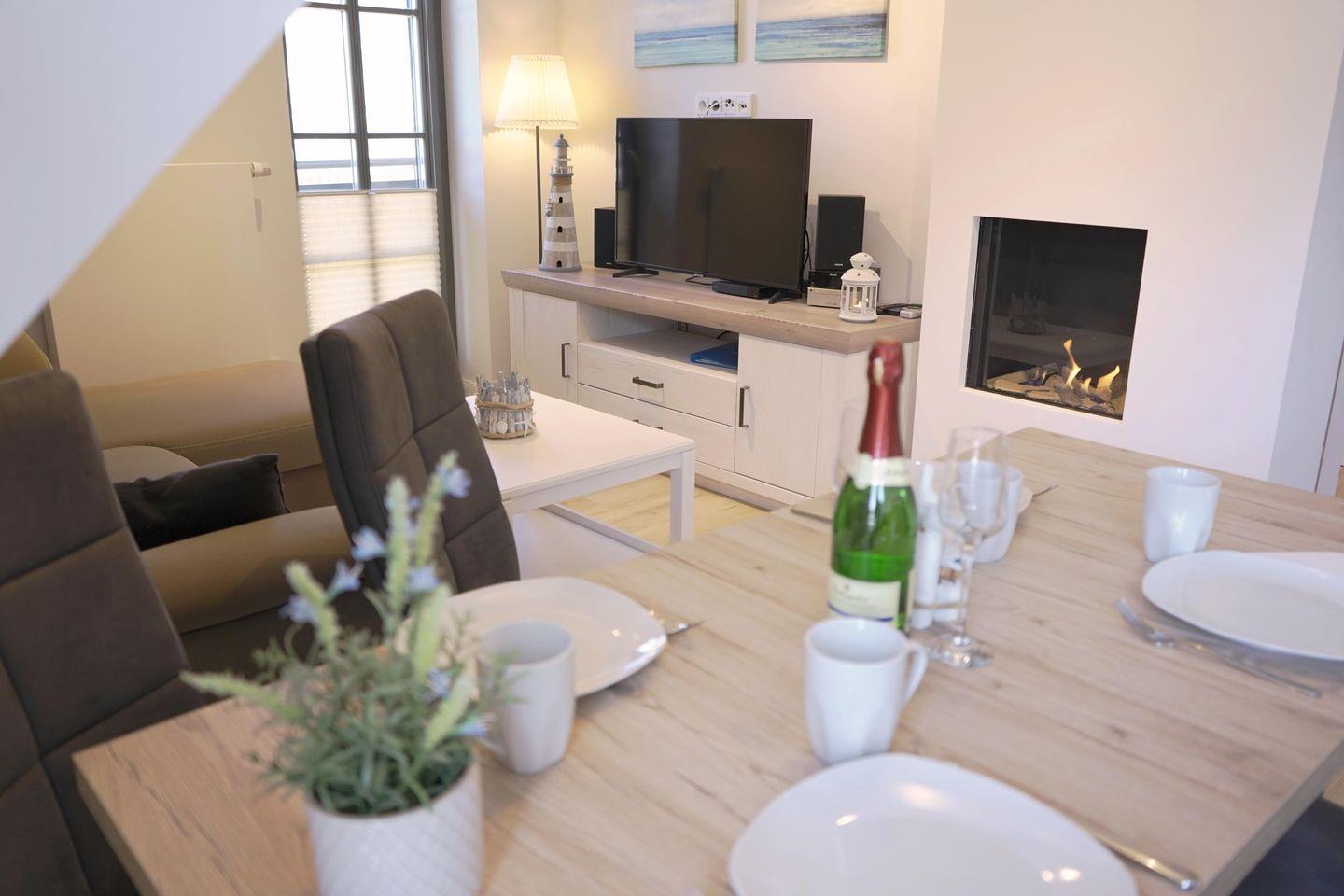 Ein Gaskamin sorgt für Gemütlichkeit, auch wenn es mal kalt sein sollte. Blu-Ray-Player, WLAN und ein Balkon mit Balkonmöbeln und Markise sowie ein Insektenschutz ergänzen die umfangreiche Ausstattung.