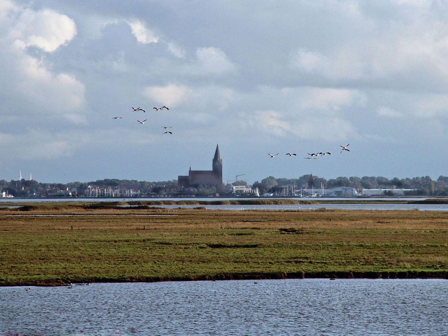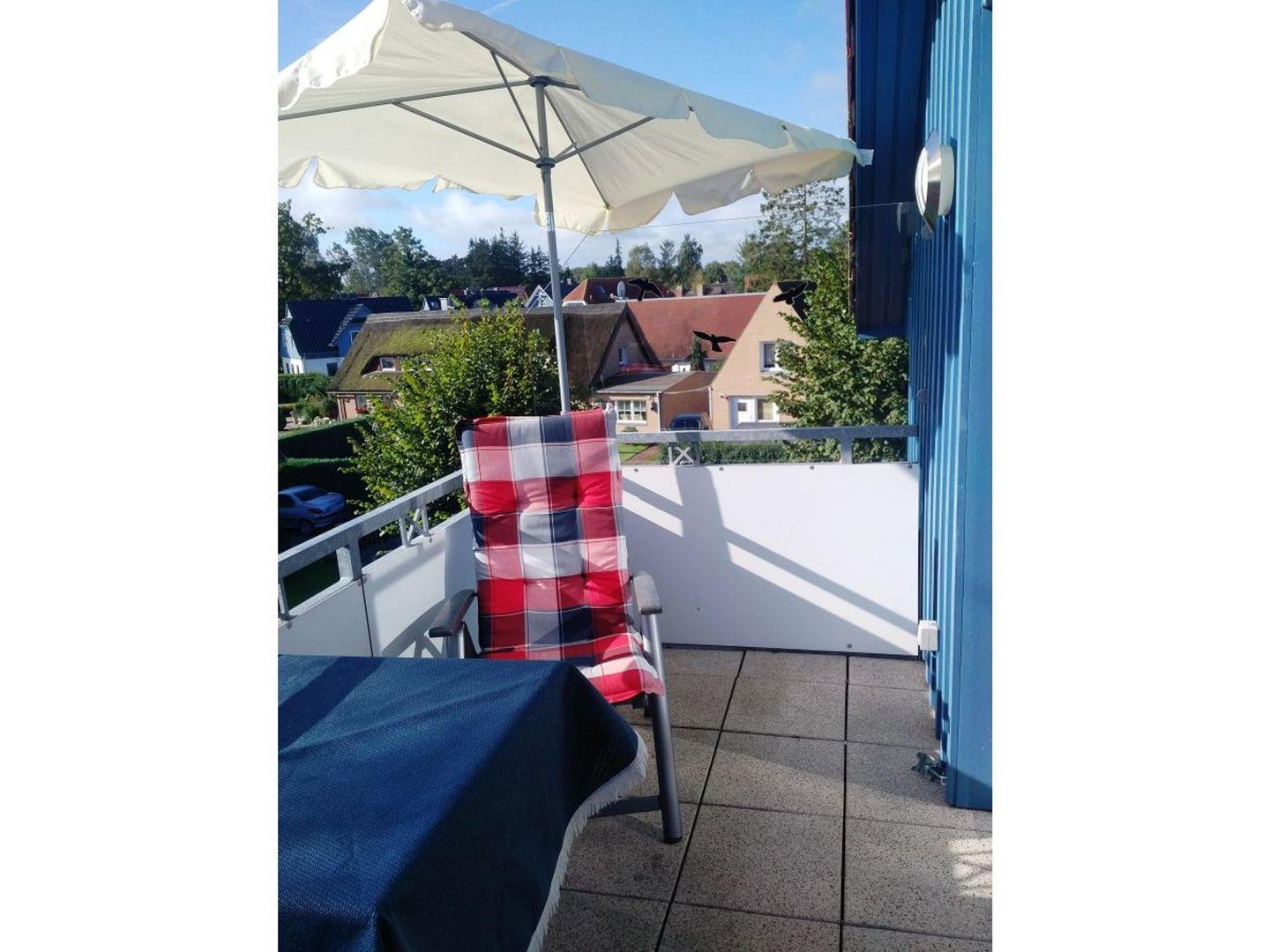 Auf dem großzügigen Balkon können Sie vom ersten Sonnenstrahl am Morgen bis zum späten Abend den freien Blick in Richtung Bodden genießen.