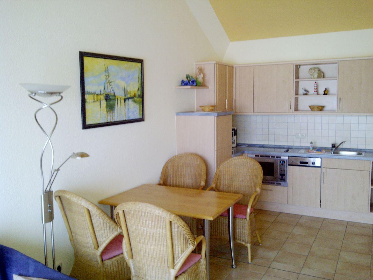 Es ist eine Zweizimmerwohnung welche neben dem großen Wohnraum mit Essbereich (4 Stühle) über eine moderne Küchenzeile mit Ceranfeldern und Mikrowelle verfügt.