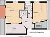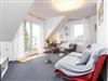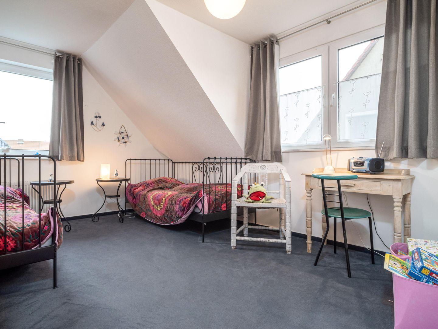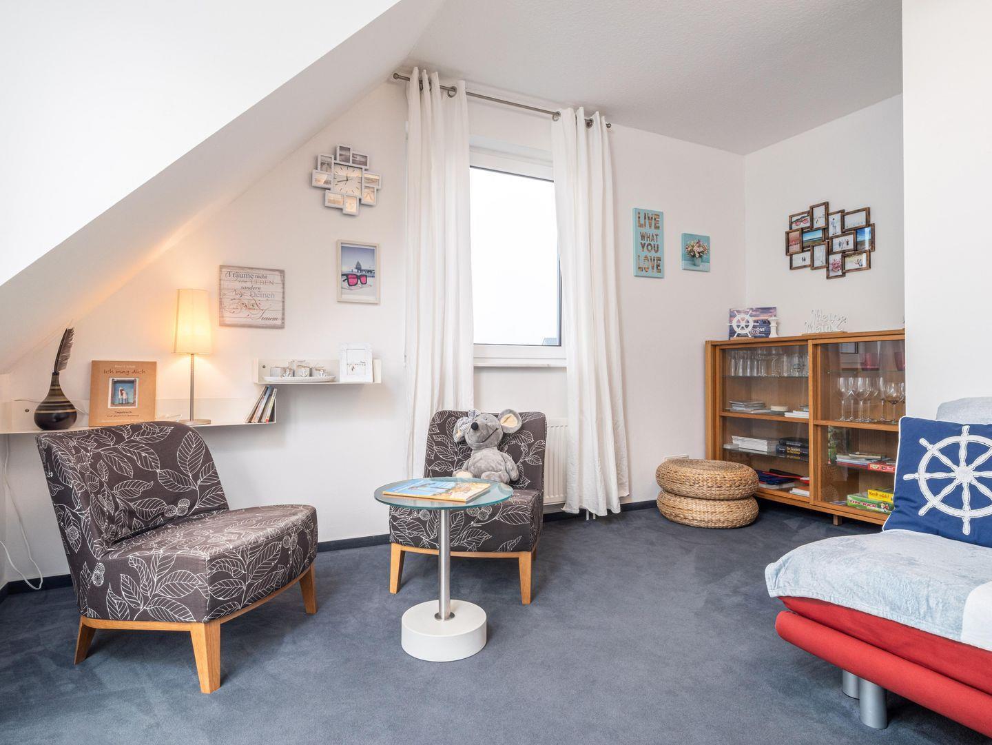 Die Nichtraucher Ferienwohnung befindet sich im Dachgeschoss auf der südwestlichen Seite eines 4-Parteien-Hauses. Die 74 m² Wohnfläche verteilen sich auf zwei Etagen, eine vollausgestattete Küche mit Esstisch, das Wohnzimmer mit Sitzecke und Schlafcouch, zwei Schlafzimmer und ein Badezimmer.