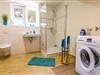 Im hellen Badezimmer ist eine Glasdusche und eine Waschmaschine zu finden.