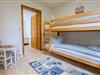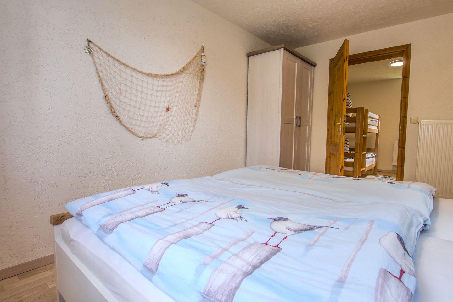 Das größere Schlafzimmer verfügt über ein Doppelbett und ermöglicht einen direkten Zugang zum Kinderzimmer mit Etagenbett und kleiner Spielecke.